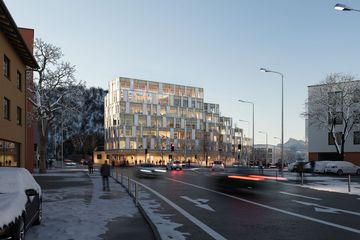 mit seiner prägnanten silhouette setzt das neue biogena headquarter einen markanten akzent am stadteingang. gleichzeitig fügt sich der gestaffelte baukörper harmonisch im stadtraum ein und reagiert sensibel auf die bestehende umgebung. durch das rückstaffeln werden der bestandspavillon und die bestandsbäume freigespielt und in szene gesetzt. die abtreppung nach süden sowie der schwebende holzkörper schaffen eine fließende verbindung zwischen gebäude und landschaft.
