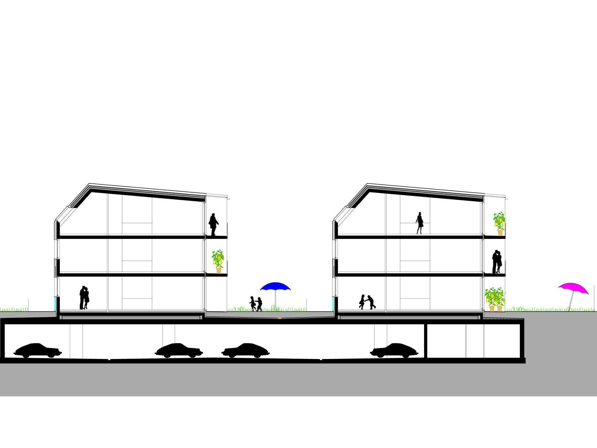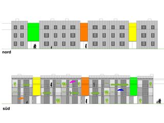 um den bewohnern viel möglichkeit zur identifikation mit ihren neuen wohnungen zu geben, wurden die baukörper in überschaubare einheiten zerlegt. der großzügige, halböffentliche freiraum ermöglicht vielfältige aktivitäten im kleinen wohnquartier. die vielfältigen wegverbindungen motivieren die kinder zum gemeinsamen spiel.