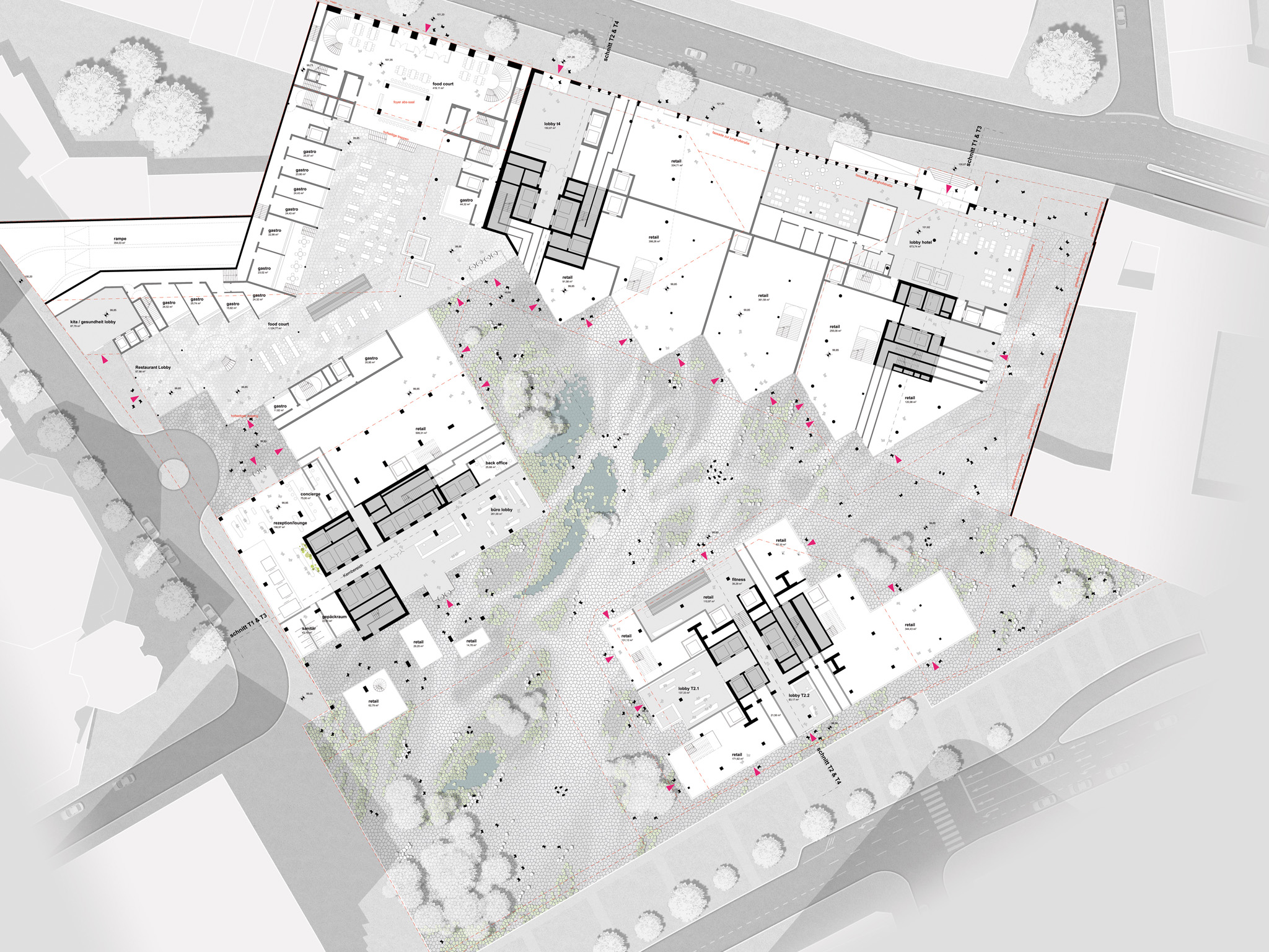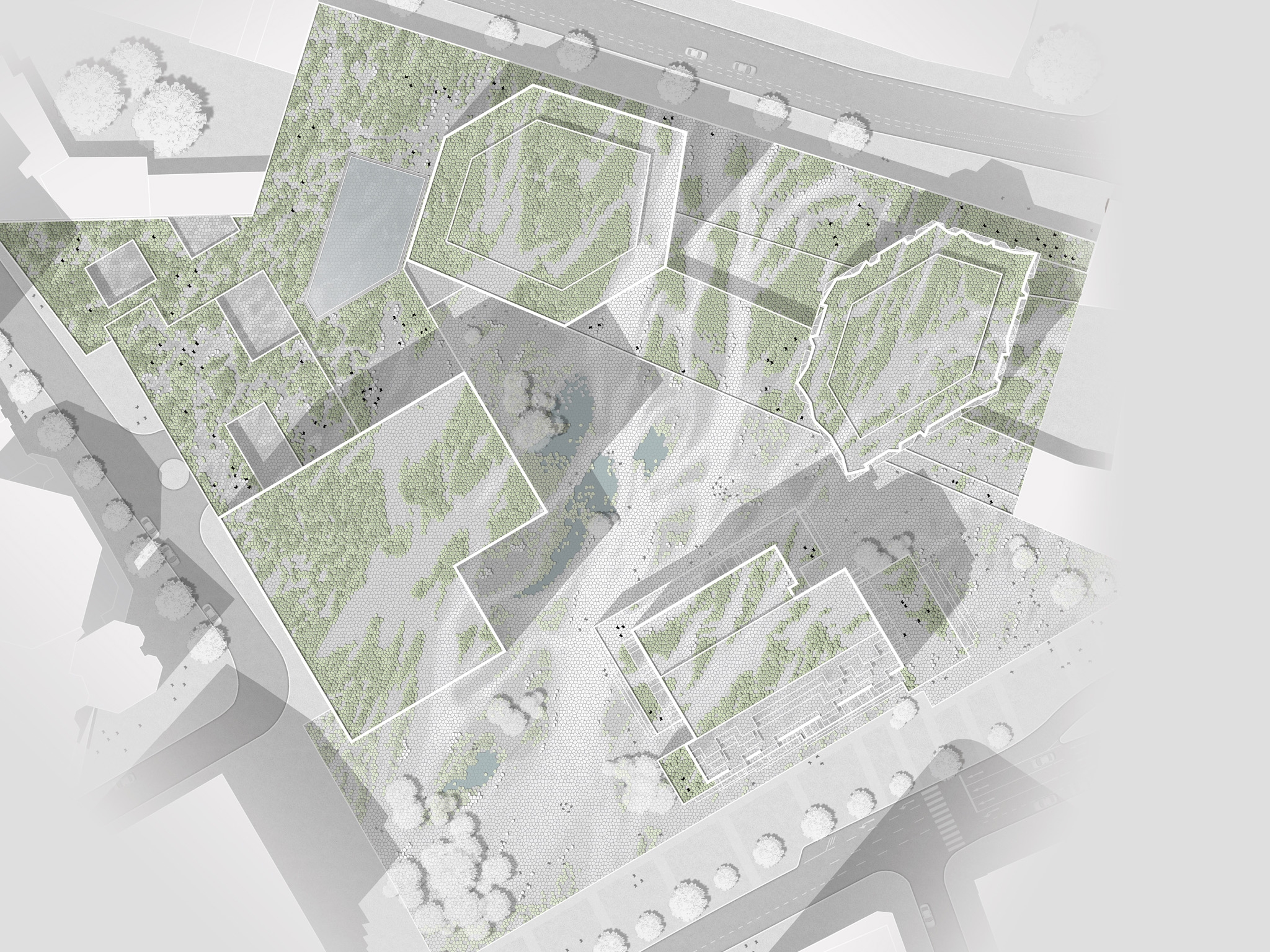 das geborgte motiv einer lebendigen naturlandschaft legt sich konsequent über alle horizontalen flächen und wird zum träger eines differenzierten, urbanen freiraums.