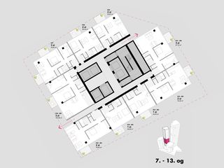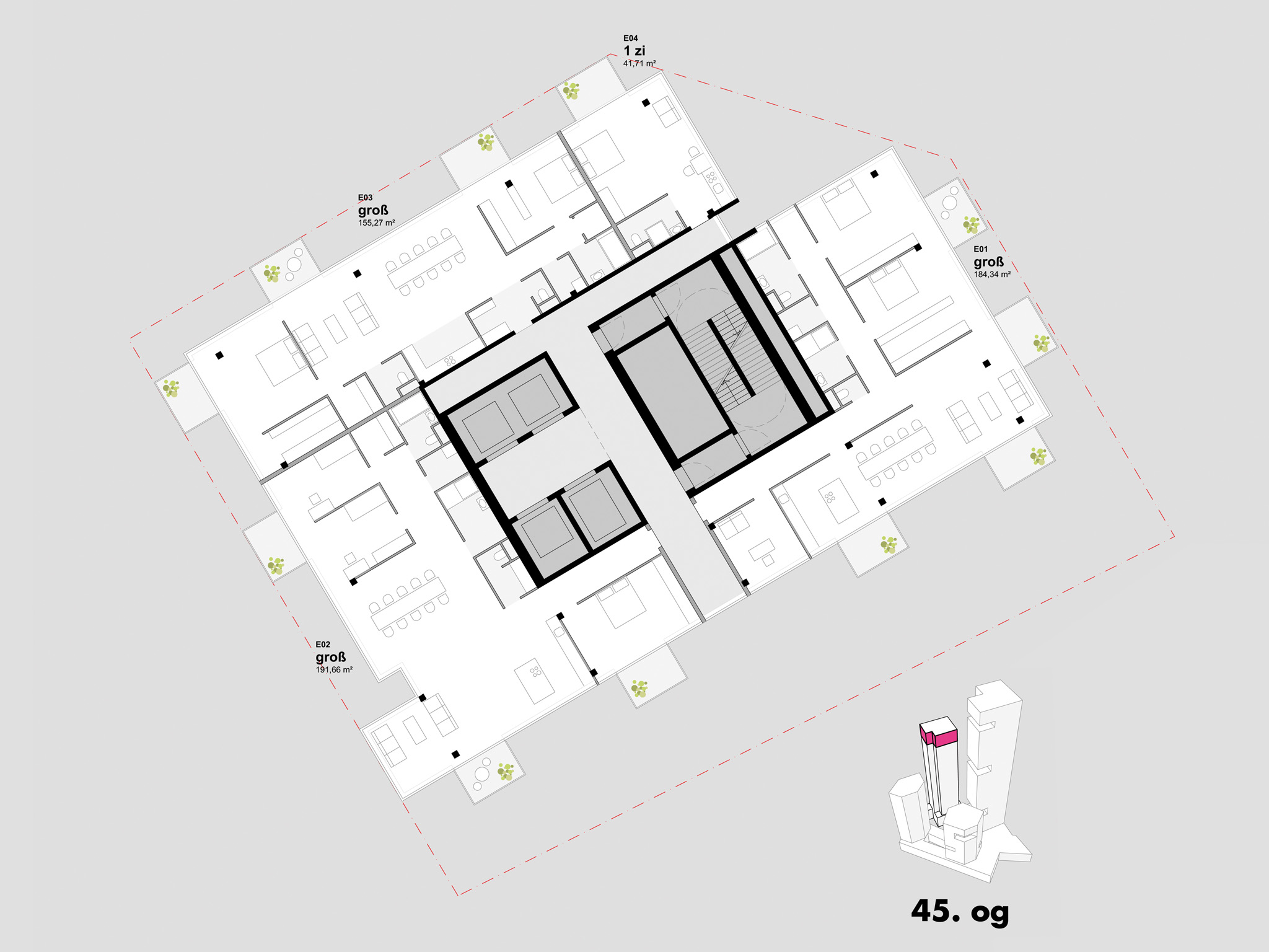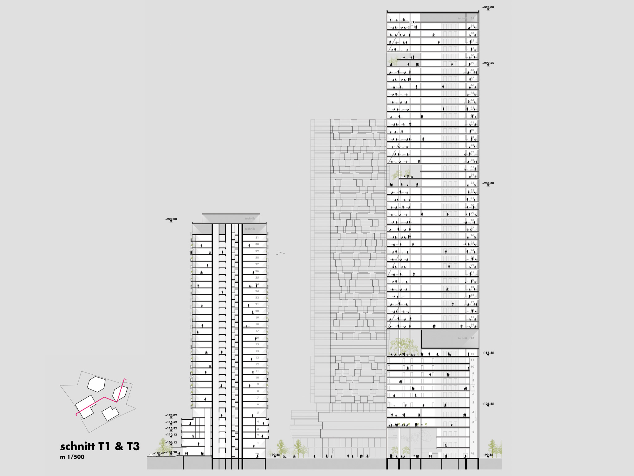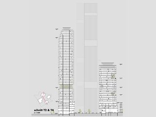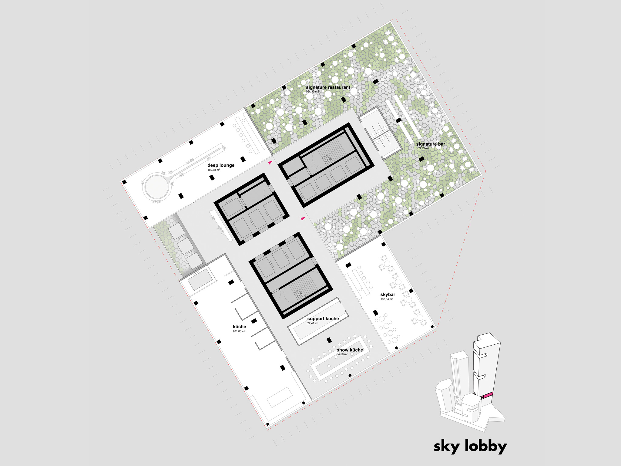 die erschließungskerne sind überwiegend natürlich belichtet und bieten ausblick und orientierung. skyspaces in den bürotürmen bilden hochwertige pausenräume, thermisch konditioniert und intensiv natürlich belüftbar. diese und kleine pausenbalkone in jedem stockwerk sind besondere orte für die schnelle pause, nur eine minute von jedem arbeitsplatz entfernt.