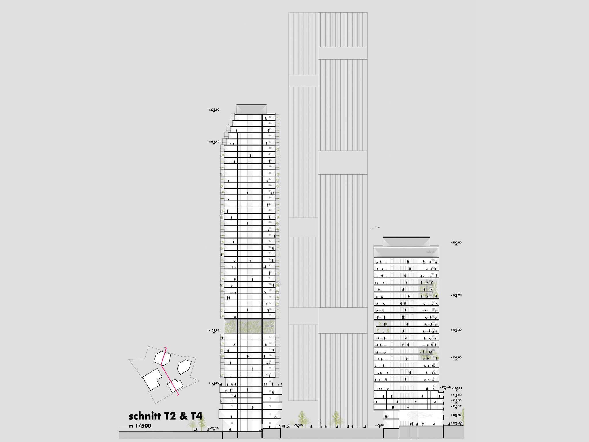 balkone und loggien in den beiden wohntürmen werden differenziert gestaltet und mit effektivem windschutz ausgestattet. hohe aufenthaltsqualität wird auch in städtischen außenräumen durch wirksamen schutz gegen fallwinde erreicht: mit einer großzügigen offenen zone im eingangsbereich und windgeschützt rückversetzter fassade, mit mäandrierenden loggien beziehungsweise ausgeprägter horizontaler gliederung durch umlaufende balkonbänder.