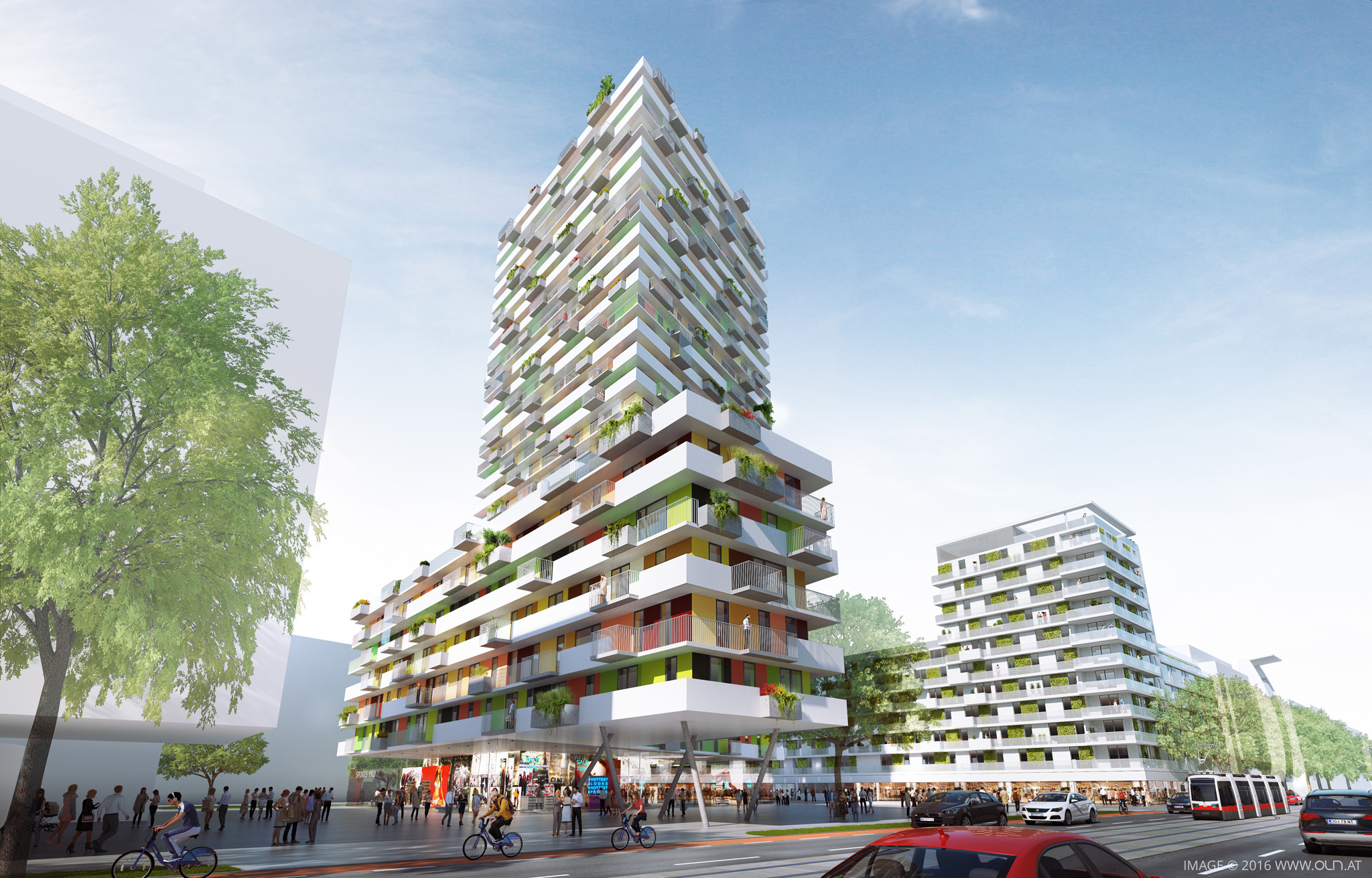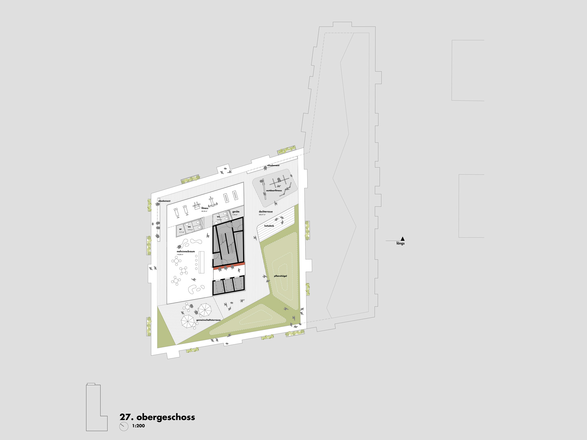 die kompaktheit der baukörper mit einem effizienten fläche-volumen-verhältnis, sowie die erschließung mit jeweils einem kern stehen für die wirtschaftlichkeit und ökologie des projektes. baumpflanzungen und pflanzbeete strukturieren den öffentlichen raum und die dachflächen werden begrünt. die dachlandschaft bietet raum für unterschiedliche nutzungen: kindergarten-freifläche, kinder- und jugendspielplatz, gemeinschaftsterrasse und möglichkeiten zum gärtnern.