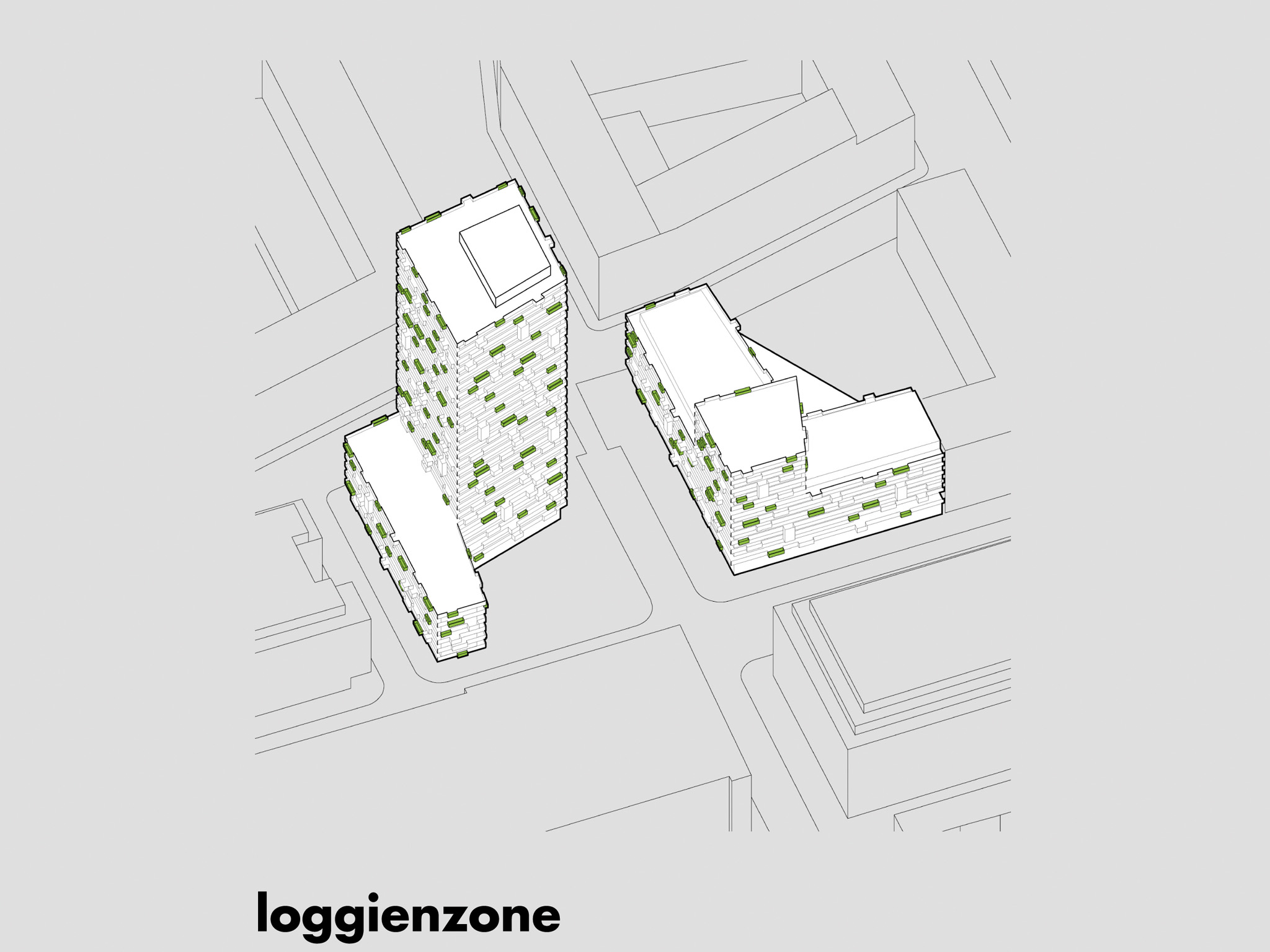 eine umlaufende 1,20 m breite loggienzone bietet jedem aufenthaltsraum zusätzlich hochwertigen freiraum. punktuell wird das loggienband auf eine nutzbare tiefe von 1.80m erweitert. 3 unterschiedliche brüstungselemente charakterisieren die loggienzone und können nach den bedürfnissen der bewohner angeordnet werden. ein lebendiges fassadenspiel wird so geschaffen.