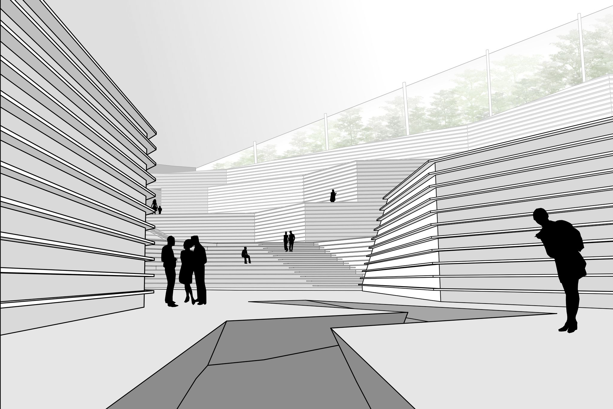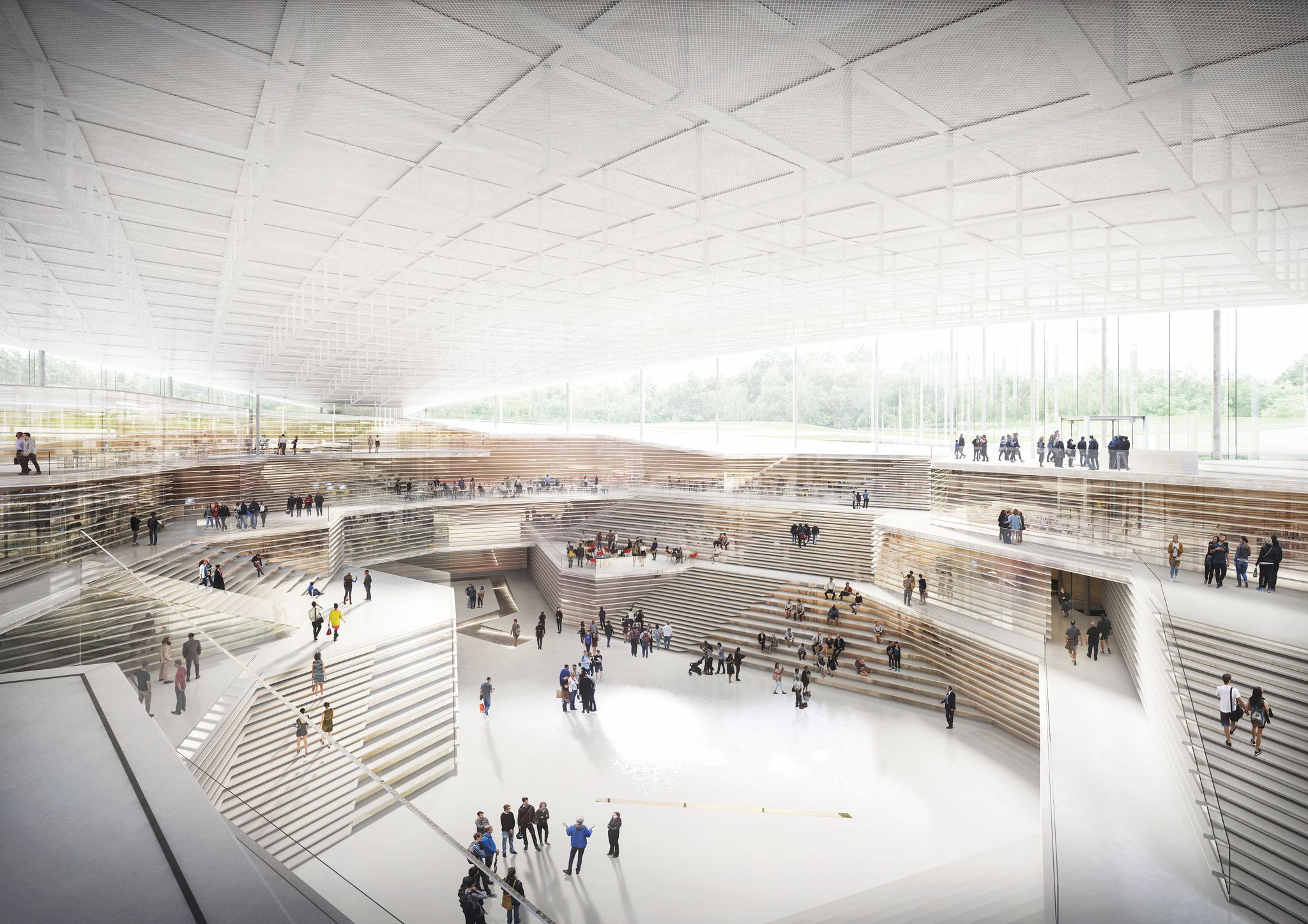 im oberen bereich der terrassierten innenlandschaft öffnet sich das als hyperbolisches paraboloid geformte dach in einer großzügigen geste, um die besucher in die umgebende naturlandschaft zu entlassen.