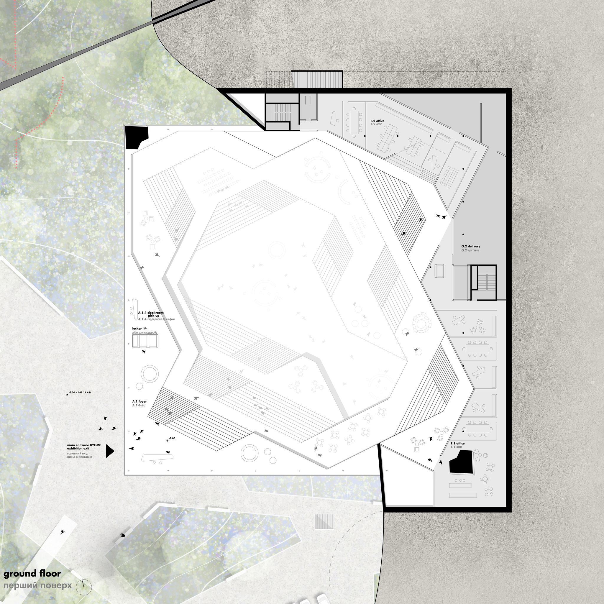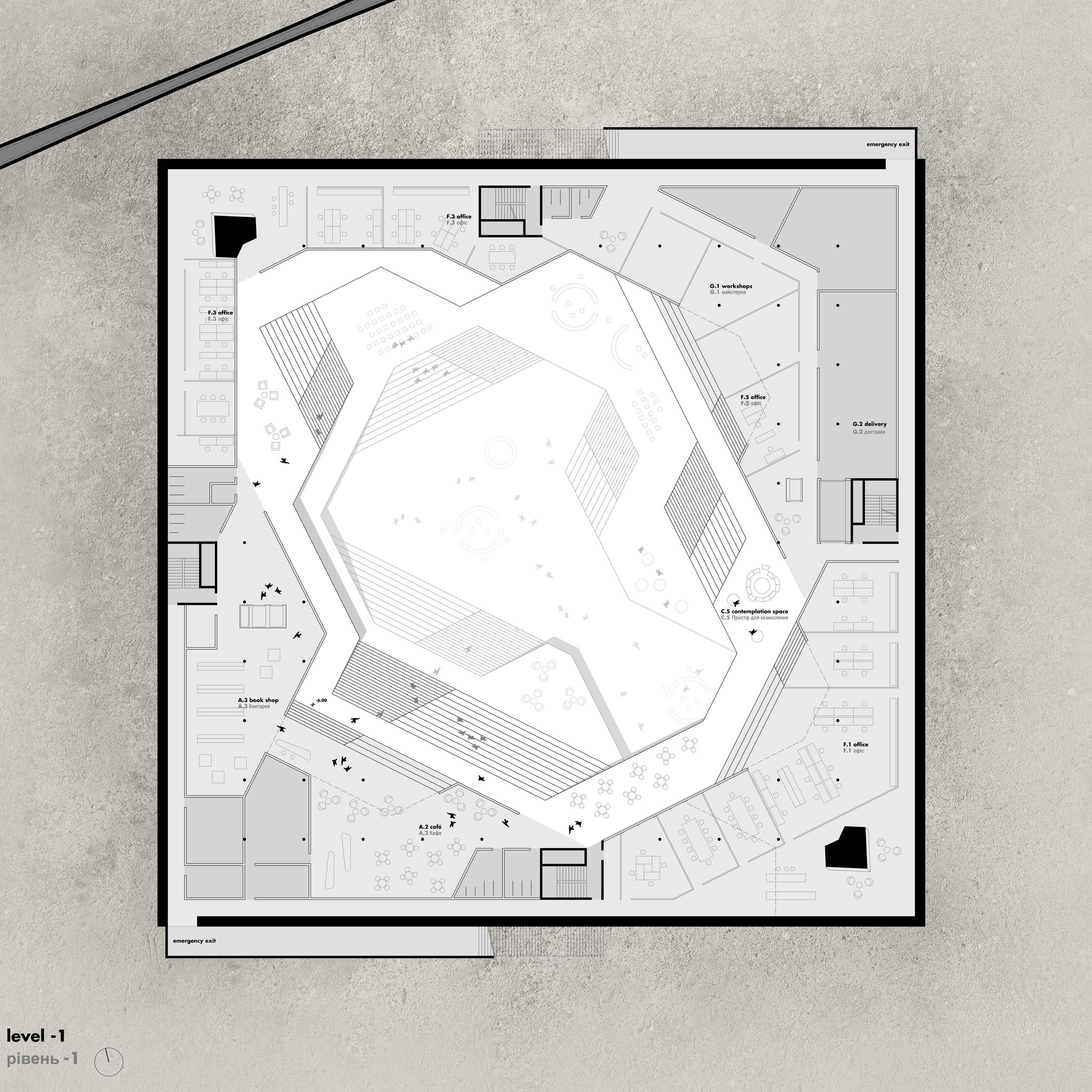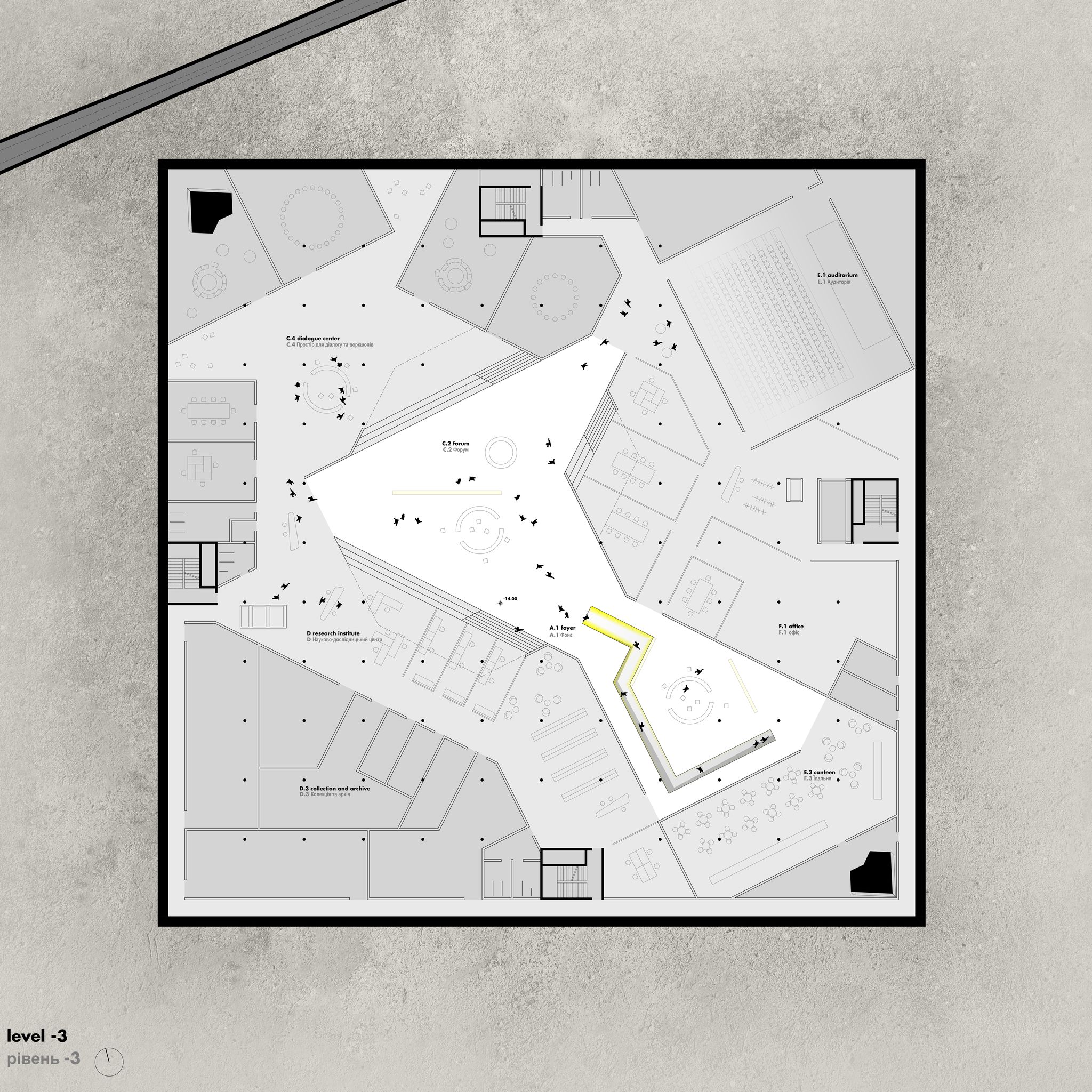 der „demokratische raum“ stellt das herzstück des gebäudes dar - eine helle, positive, offene und begehbare terrassenlandschaft. diese landschaft ermöglicht es den besuchern, ihre individuellen wege durch das memorial center zu wählen, und beherbergt funktionen wie auditorium, foyer und forschungsräume. die architektur schafft eine starke verbindung zwischen besuchern, forschern und mitarbeitern. aufgrund seiner vielfältigen form bietet dieser „demokratische raum“ sowohl bereiche des dialogs als auch orte der reflektion.
