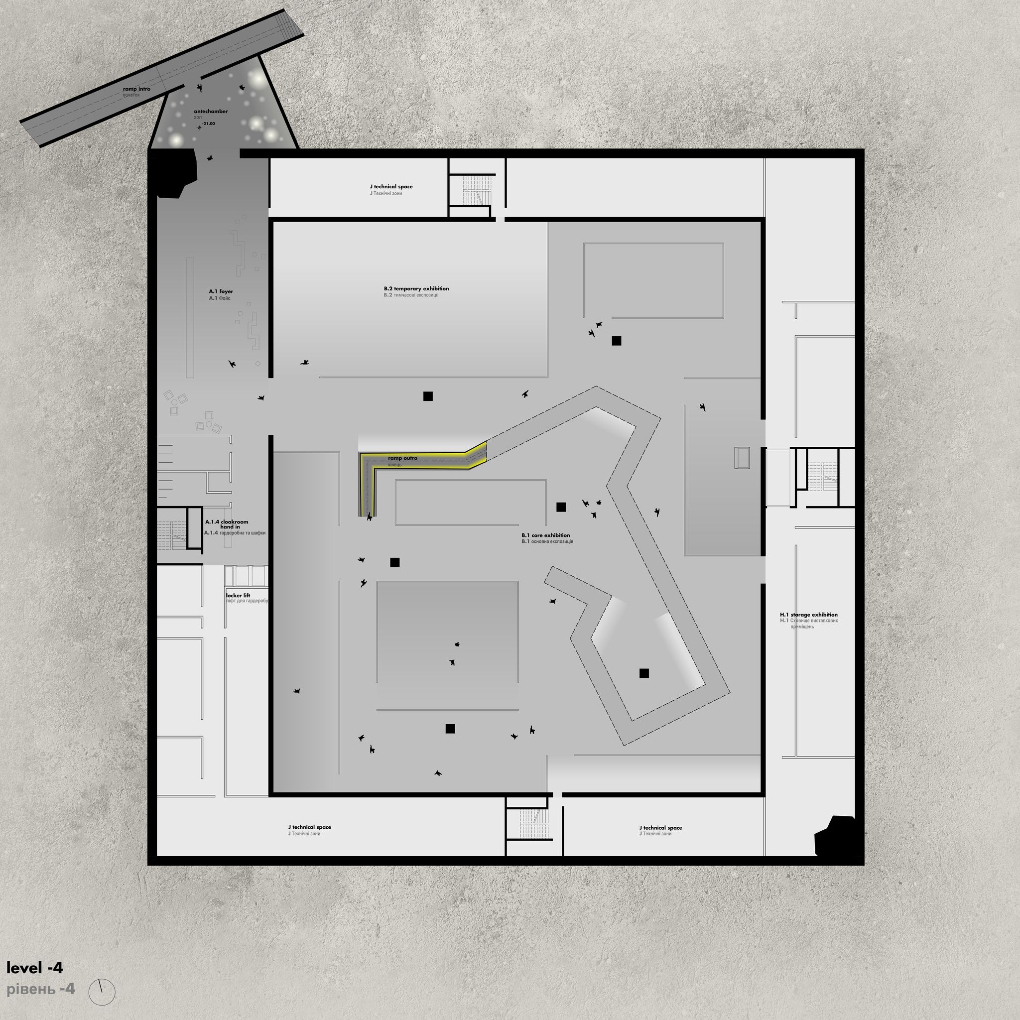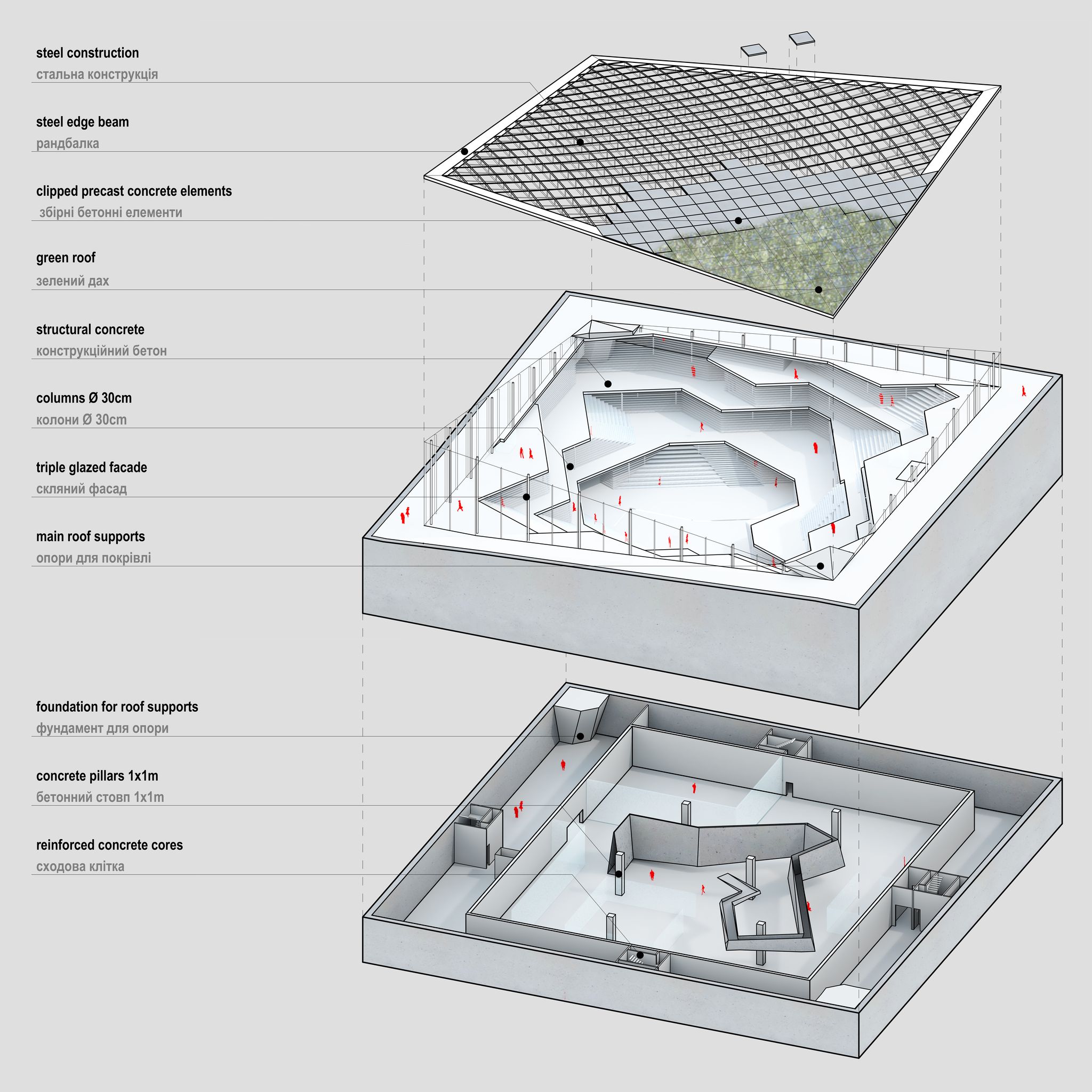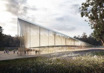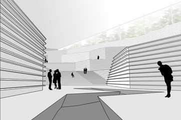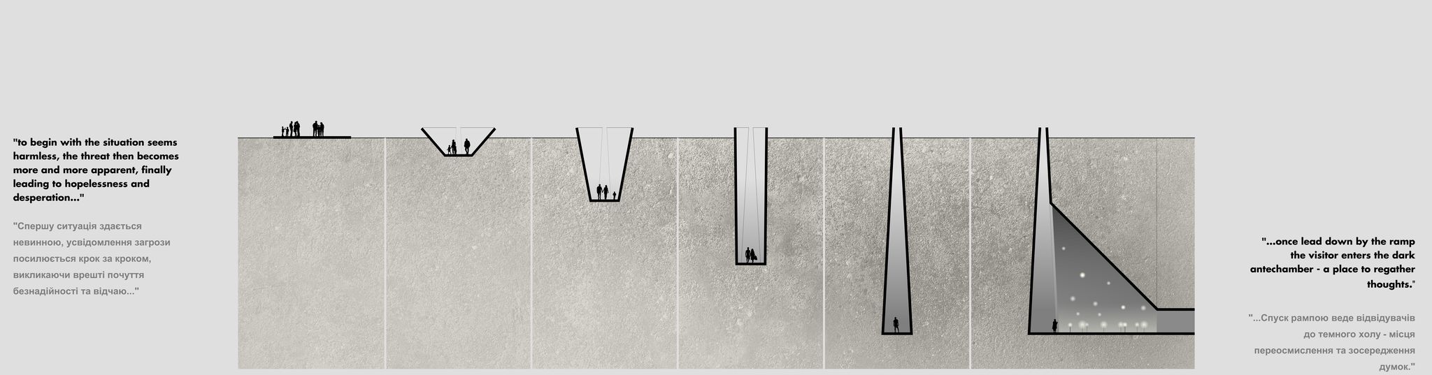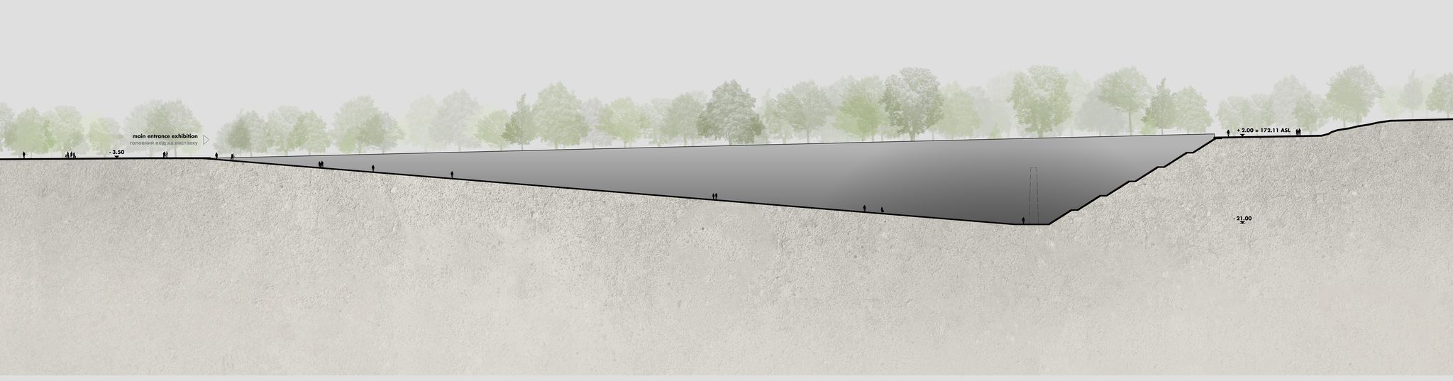 das unterirdische gebäude wird durch einen 270 meter langen einschnitt in die landschaft erschlossen - eine begehbare skulptur. die anfangs noch ebenen seitenflächen falten sich beim hinabgehen bis auf 20m tiefe allmählich über dem besucher zusammen. dieser erlebt währenddessen eine sich langsam verändernde belichtung und akustische atmosphäre. unten angekommen, betritt er die dunkle vorkammer - ein ort, an dem er seine gedanken sammeln kann.