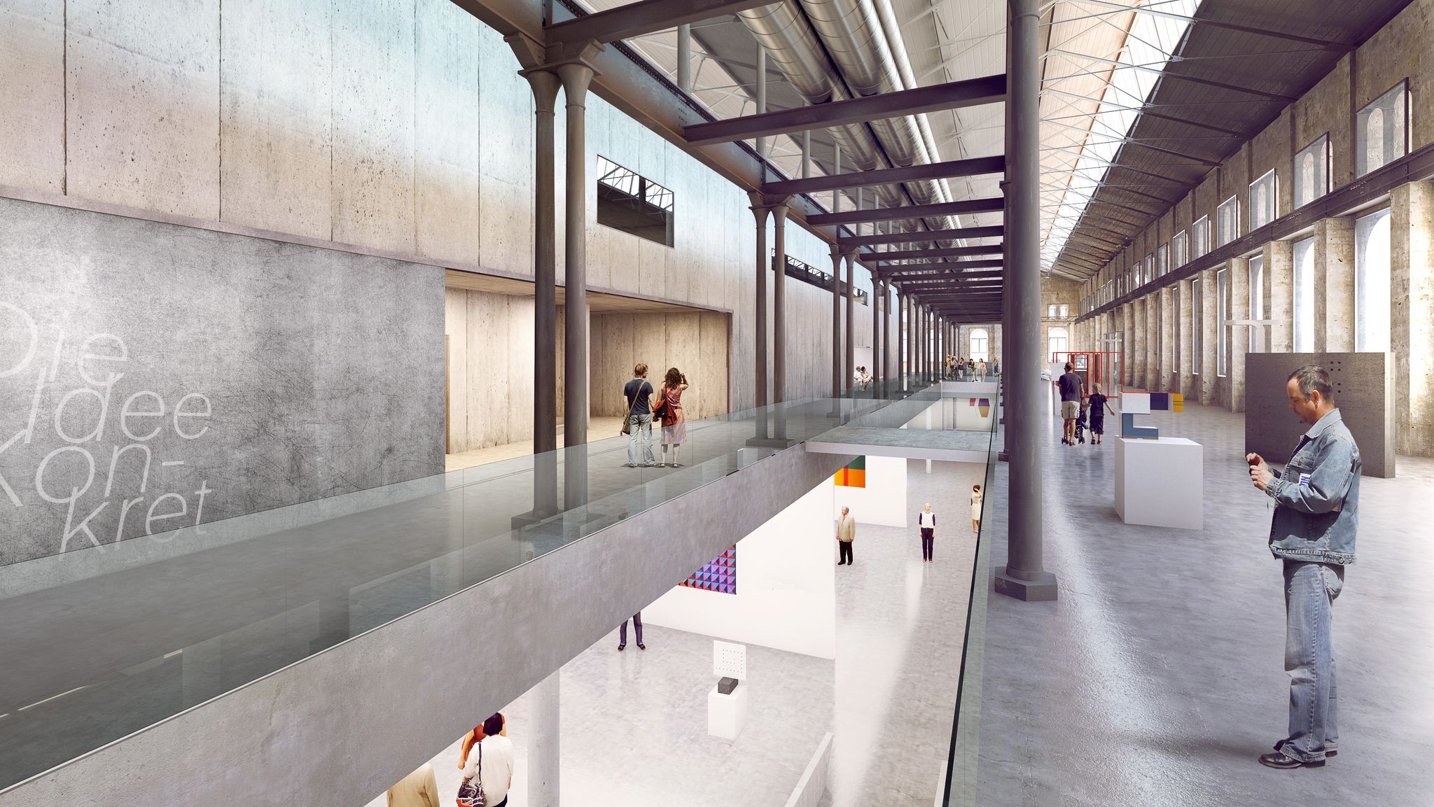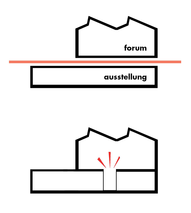 um den eindrucksvollen innenraum der halle zu erhalten und gleichzeitig die anforderungen eines kunstmuseums zu erfüllen, wird die halle als öffentliches forum adaptiert, während im untergeschoss ein wandelbarer ausstellungsraum entsteht. großzügige einschnitte im halleninneren verbinden beide bereiche und bieten tiefe einblicke in das museum, um die schwelle zwischen kunst und öffentlichkeit abzubauen. die bestehende halle bleibt erhalten und instandgesetzt und bietet platz für den museumseingang, gastronomie und flexible multifunktionsflächen. der großzügige vorplatz zieht sich von außen nach innen und ermöglicht eine abwechslungsreiche bespielung, was die halle belebt und die öffentlichkeitswirkung verstärkt.