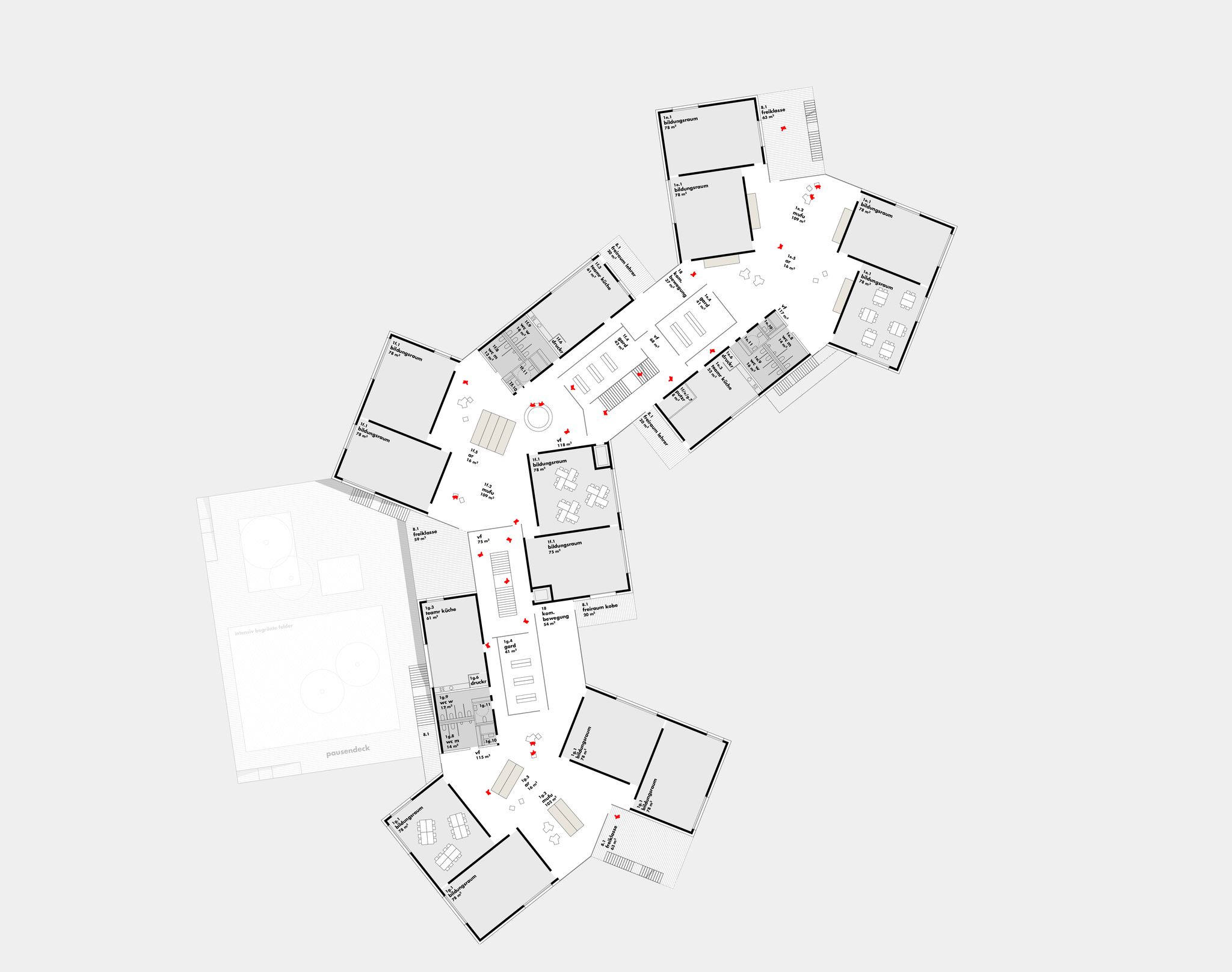 die bildungsräume rotieren um die multifunktionale zone als herz des clusters und bilden dadurch eine gut belichtete und differenzierte lernlandschaft.