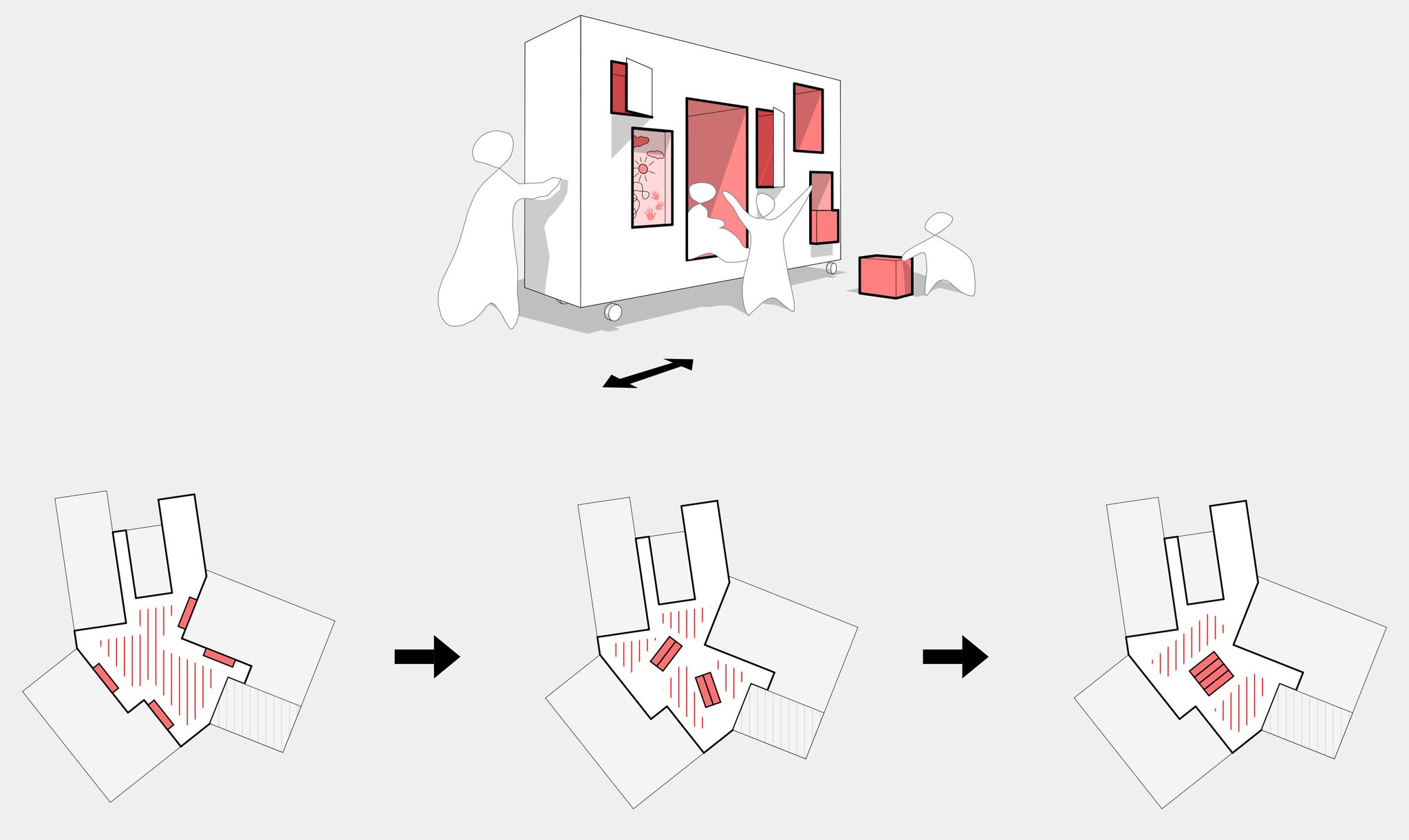 der charakter der mufu fläche kann zusätzlich durch die flexiblen klassenmöbel verändert werden. die "abstellräume auf rollen" zonieren den cluster je nach bedarf von offen bis kleinteilig.