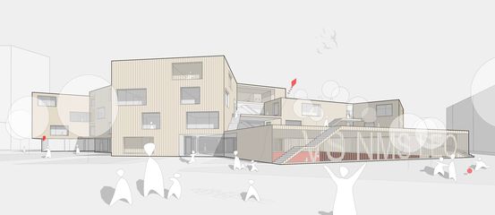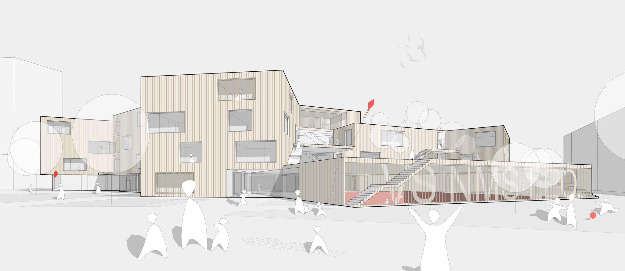 die kleinteilige und kindgerecht gegliederte gebäudeform entwickelt sich aus der vervielfältigung und manipulation des clustergrundmoduls.