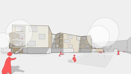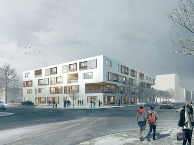 der bogenförmige baukörper spielt sich von der umgebungsbebauung frei, vermeidet parallele fronten, schirmt den lärm ab und definiert unterschiedliche freiraumqualitäten.