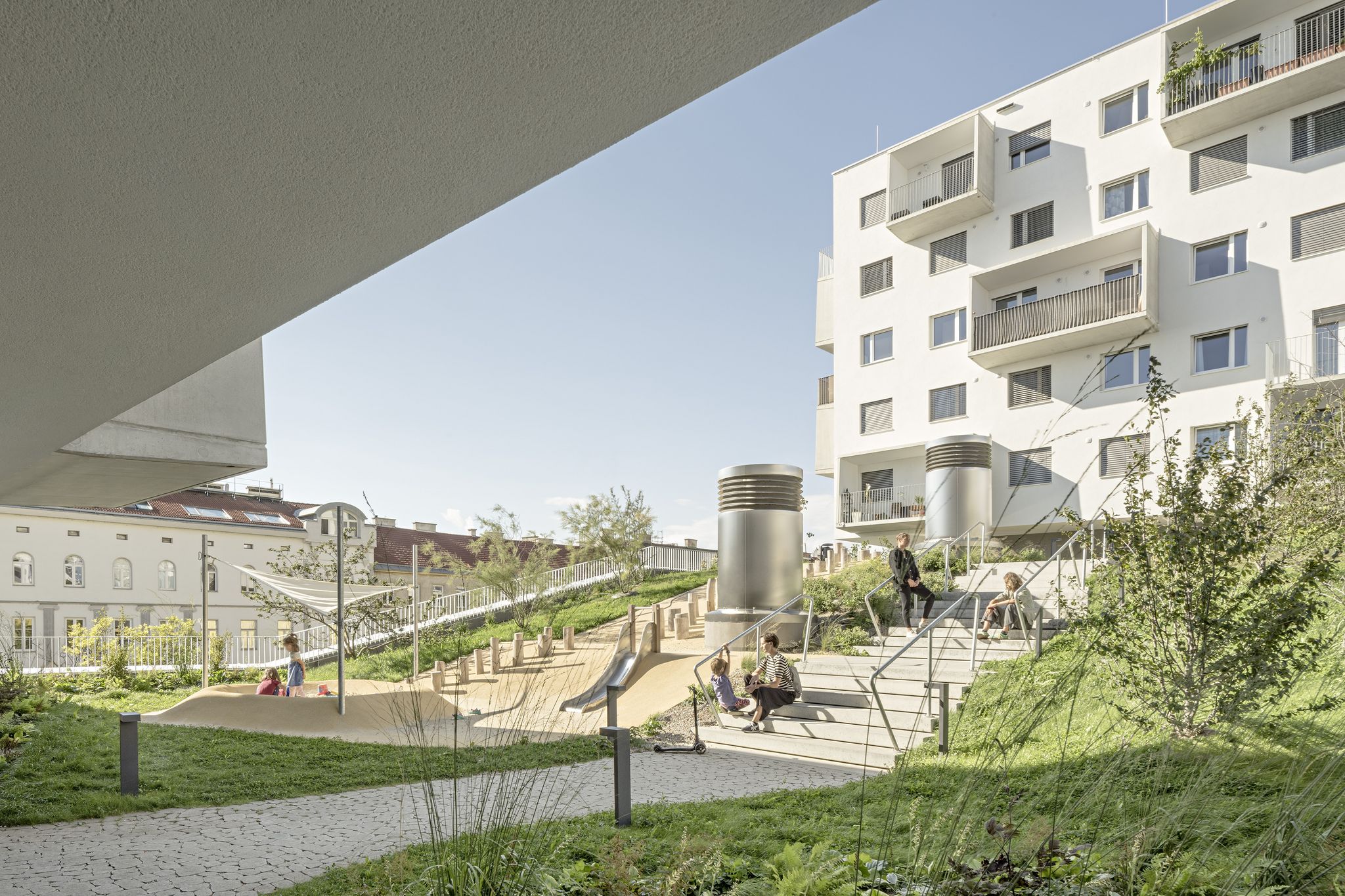 im erdgeschoß tragen transparente hauseingänge und zur straße hin orientierte handelsflächen zur adressbildung bei. eine suppenbar, ein reparaturcafé der volkshilfe sowie die produktionsschule mit vorgelagertem werkgarten beleben den durchgang zur „freien mitte“. die begrünung des gebäudes ist vielfältig: ein gering versiegeltes erdgeschoß, fassadenbegrünung am sockel durch pflanztröge, große erdkoffer auf der dachterrasse für stauden, beete und bäume, pflanzhügel, topfpflanzen und eine blumenwiese am dach sorgen für ein angenehmes stadtklima und unterstreichen das grüne konzept der anlage.