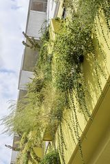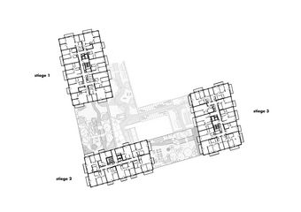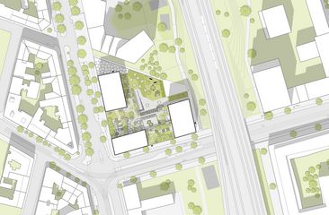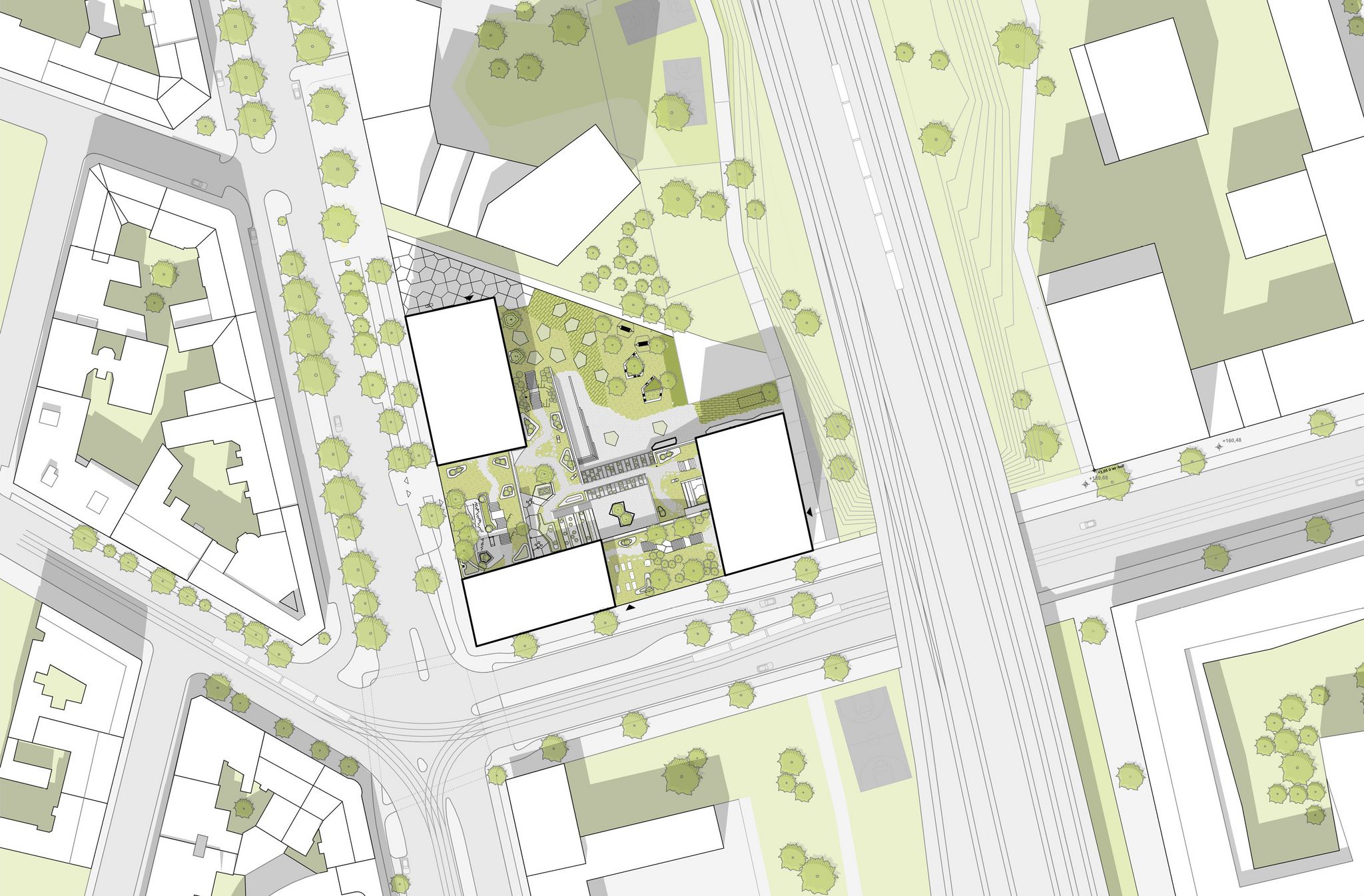 auf dem begrünten sockel, der sich wie ein grünes band kaskadenförmig bis ins fünfte geschoß windet, stehen drei baukörper – einer 30 meter und zwei 35 meter hoch. die horizontale schichtung mit sockel, zäsurgeschoß und freigestellten hochpunkten unterteilt die gesamtkubatur in klar lesbare, maßstäbliche volumen. die fassaden sind geprägt von luftigen loggien und balkonen mit großzügigen trögen für die fassadenbegrünung.