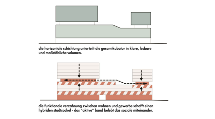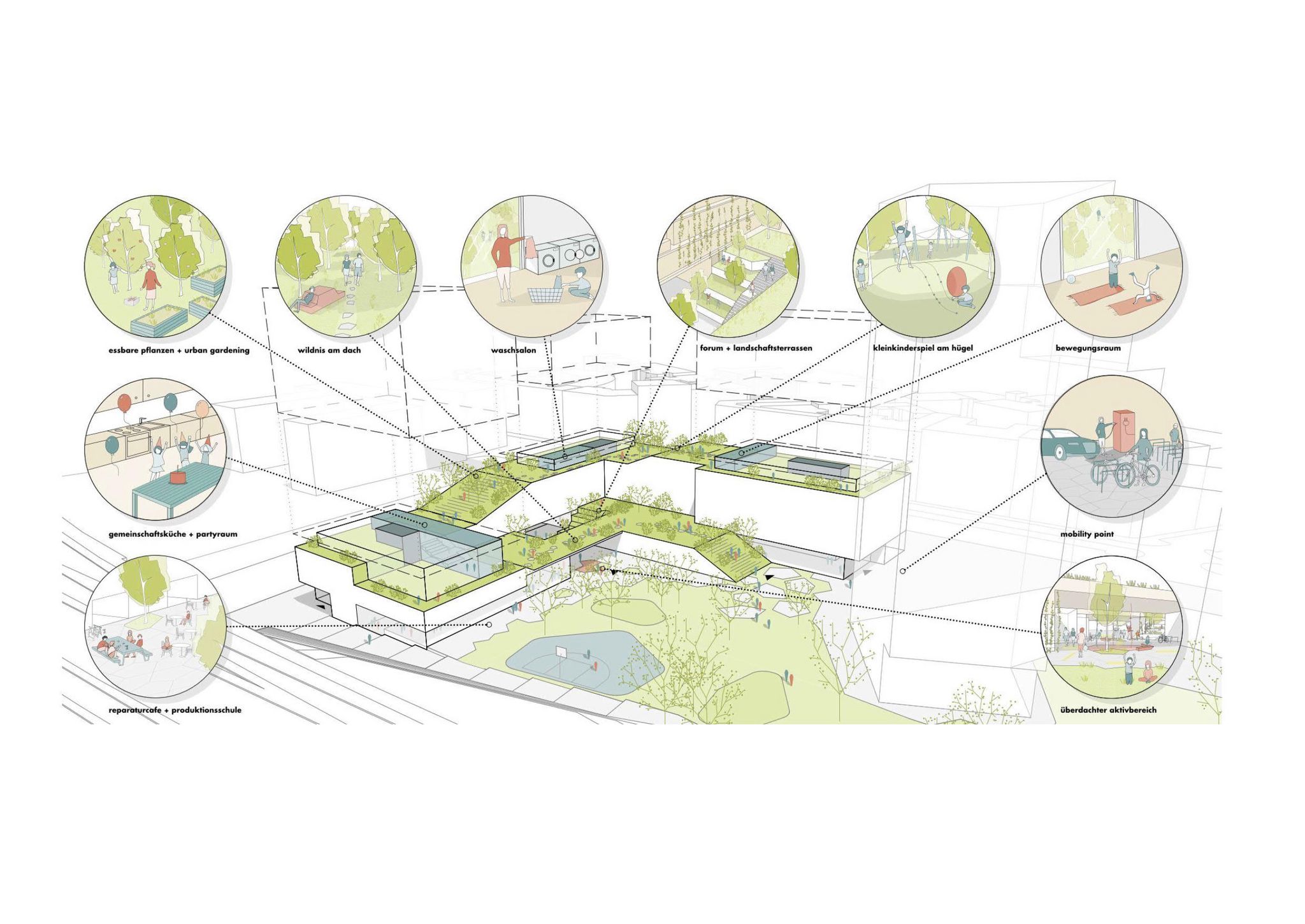 die nach oben verlaufende freiraumlandschaft wird von unterschiedlichen nutzergruppen und gemeinschaftsräumen belebt. wohngemeinschaften, büros und maisonettewohnungen sind zum freiraum hin orientiert und durch gemeinschaftseinrichtungen wie eine küche, waschküche, bewegungsraum, urban gardening und einen kinderspielplatz ergänzt. diese bereiche sind in unterschiedliche öffentlichkeitsniveaus gegliedert und fördern das zusammenleben der bewohner*innen.