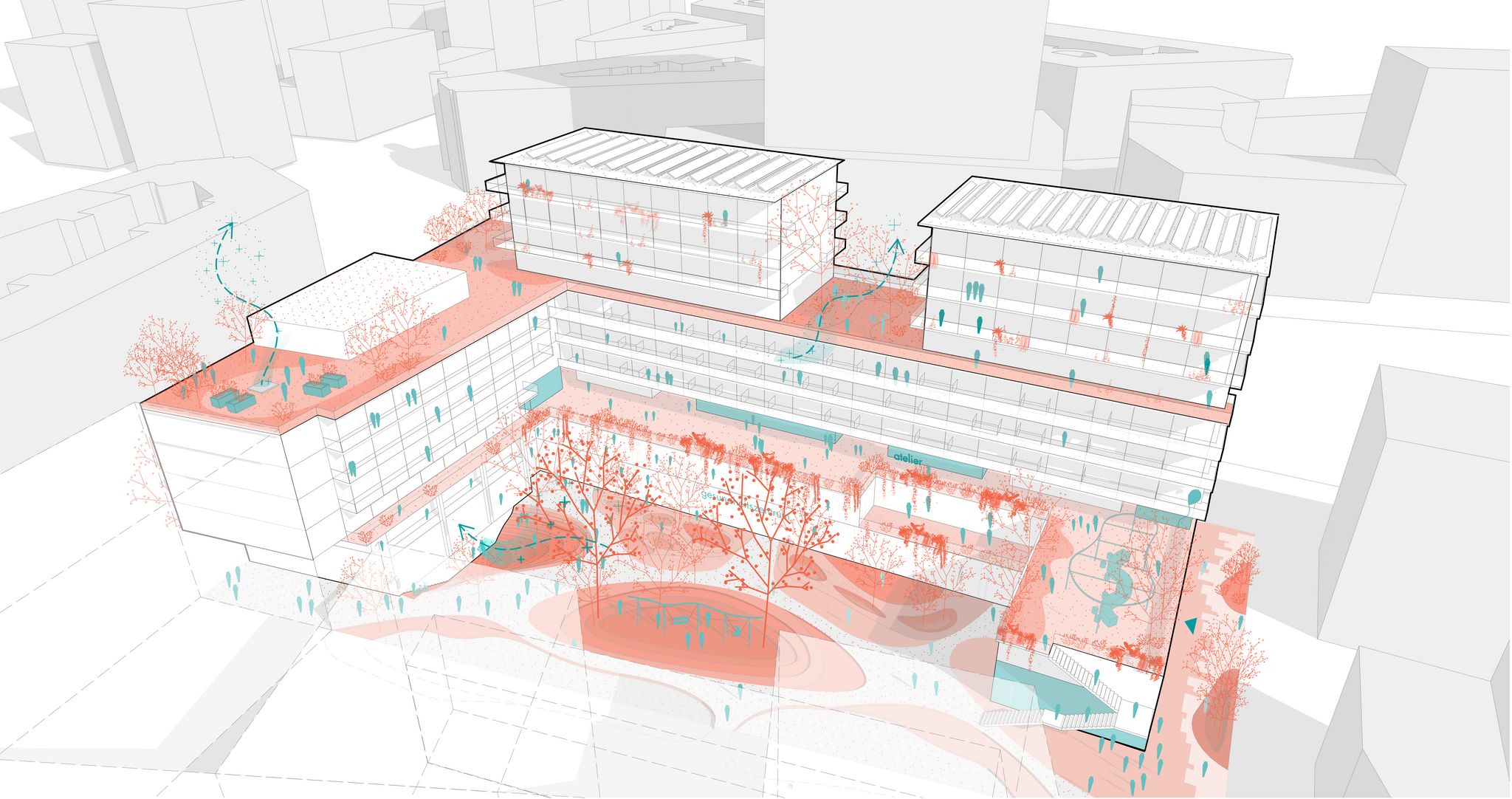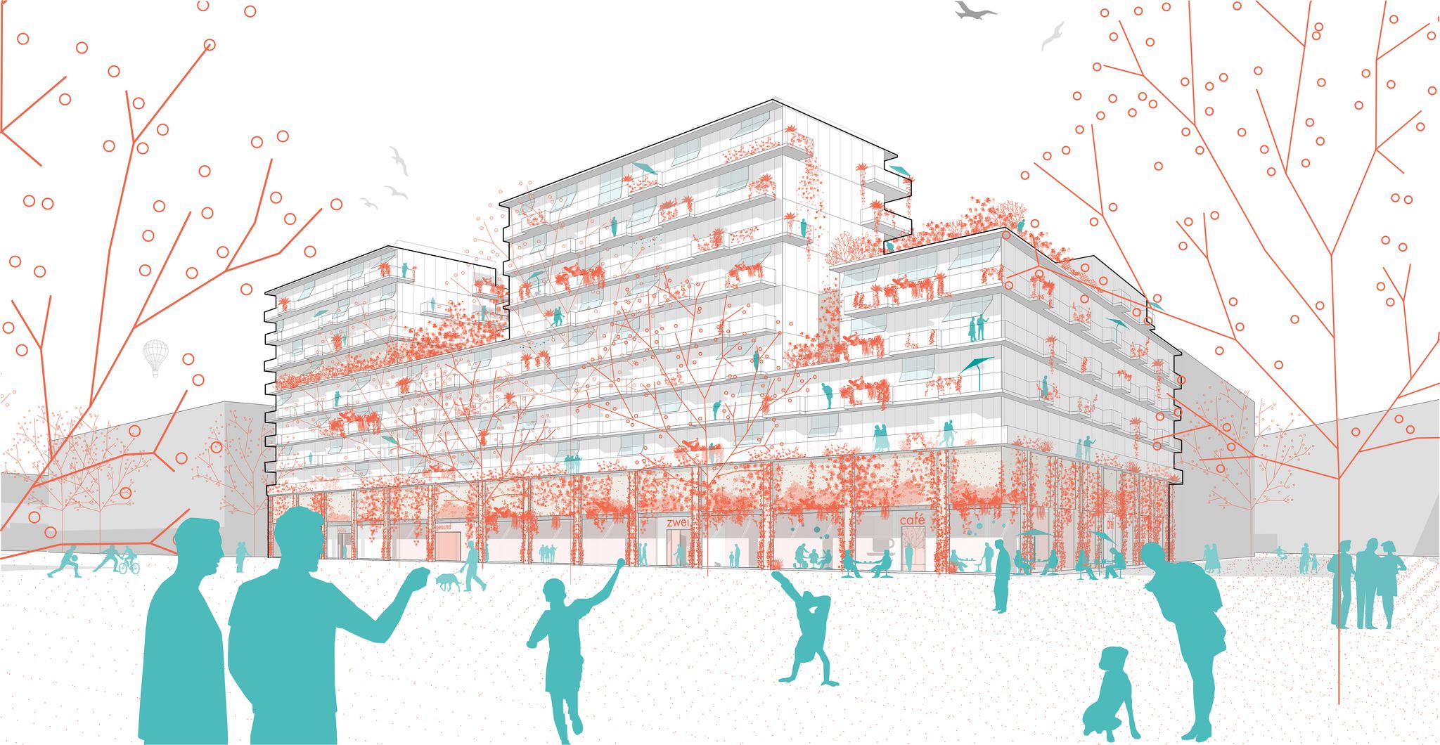 ein zweigeschossiger gewerbesockel bietet platz für vielfältige begegnungsräume und gemeinschaft, wodurch auch das grätzl belebt wird. von urban gardening bis hin zu moderierten nachbarschaftsprojekten fördert das haus soziale bindungen und unterstützt eine nachhaltige lebensweise. begegnungszonen wie das sonnen- und gartendeck im hof und auf dem dach bieten raum für alle generationen – sei es durch gemeinsames gärtnern, kochen oder spielen. speziell gestaltete bereiche für alleinerziehende, senior:innen und kinder bieten eine inklusive, sozial nachhaltige lebensumgebung.