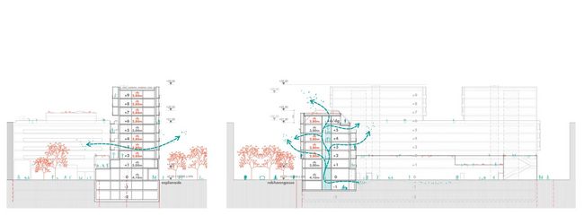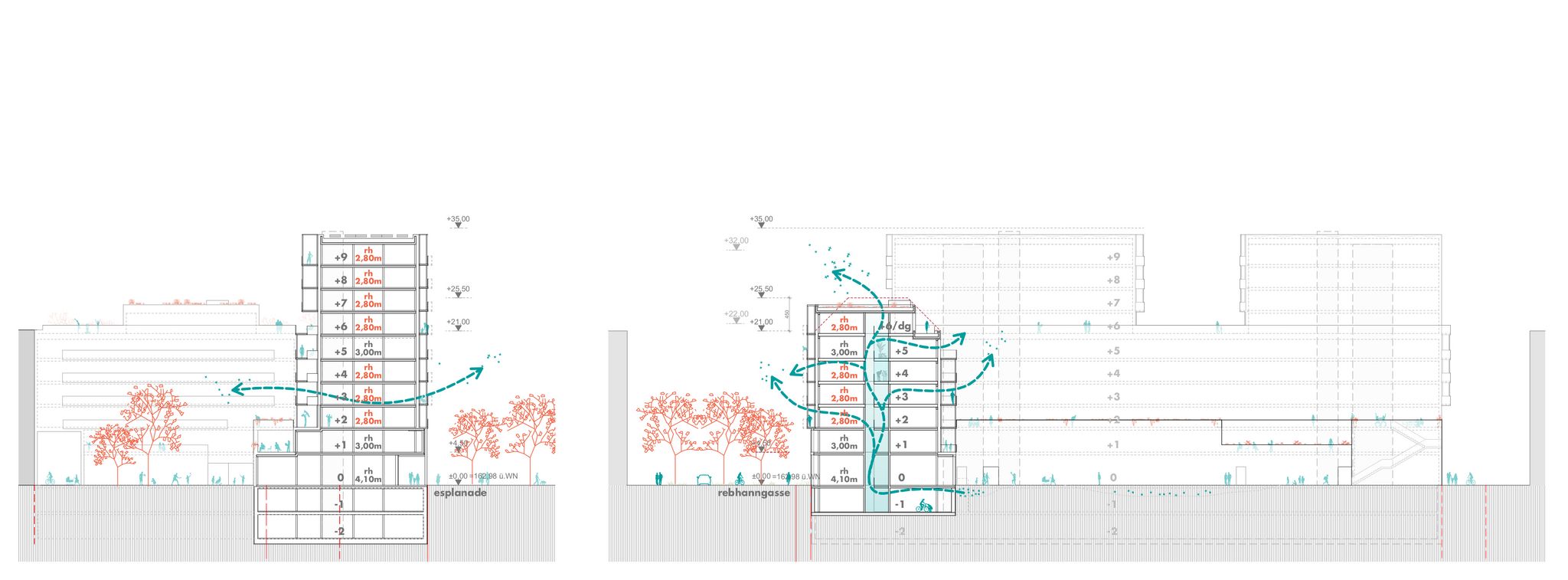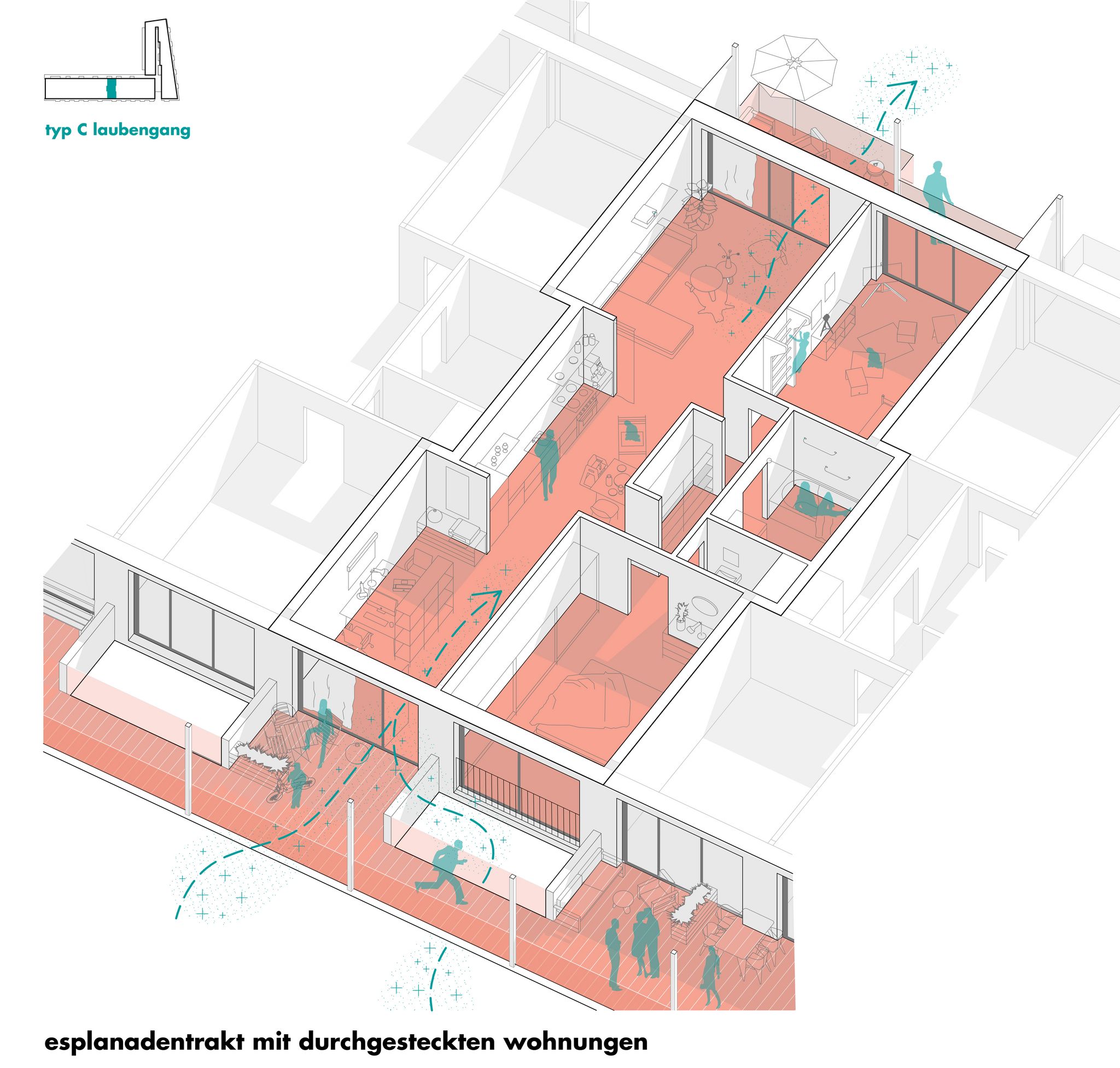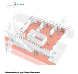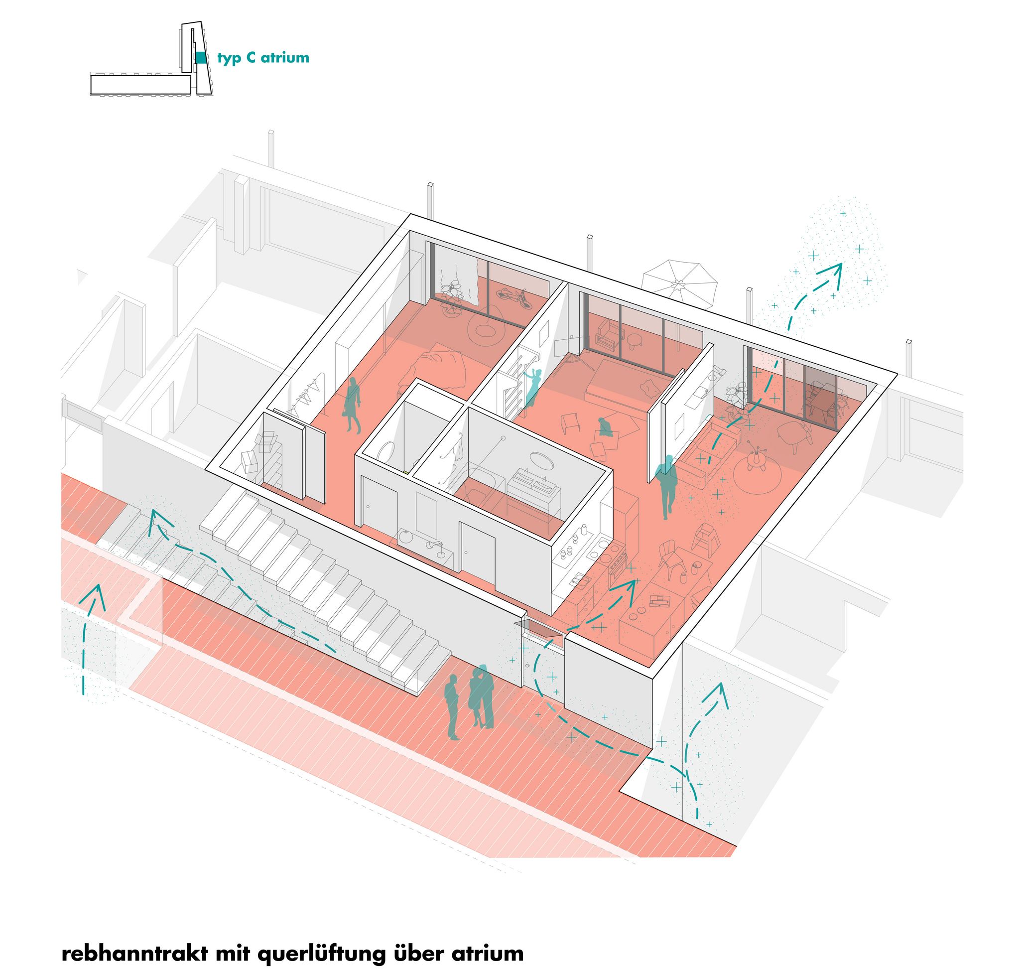 das projekt „luv + lee“ steht für innovative wohnformen, die die anforderungen des klimawandels und der gesellschaft vereint. mit einem fokus auf low-tech-lösungen und natürliche thermik schafft das gebäude ein nachhaltiges, durchlüftetes wohnklima. durch die nutzung von wind und kaltluftseen sorgen der luftdurchströmte atriumbau und durchgesteckte laubengangwohnungen für eine natürliche kühlung, während flexible grundrisse die bedürfnisse verschiedenster bewohner:innen berücksichtigen. das gebäude bietet wohnungen von typ b bis zu großen familienwohnungen von typ e und sogar typ f.