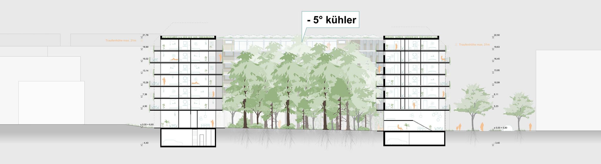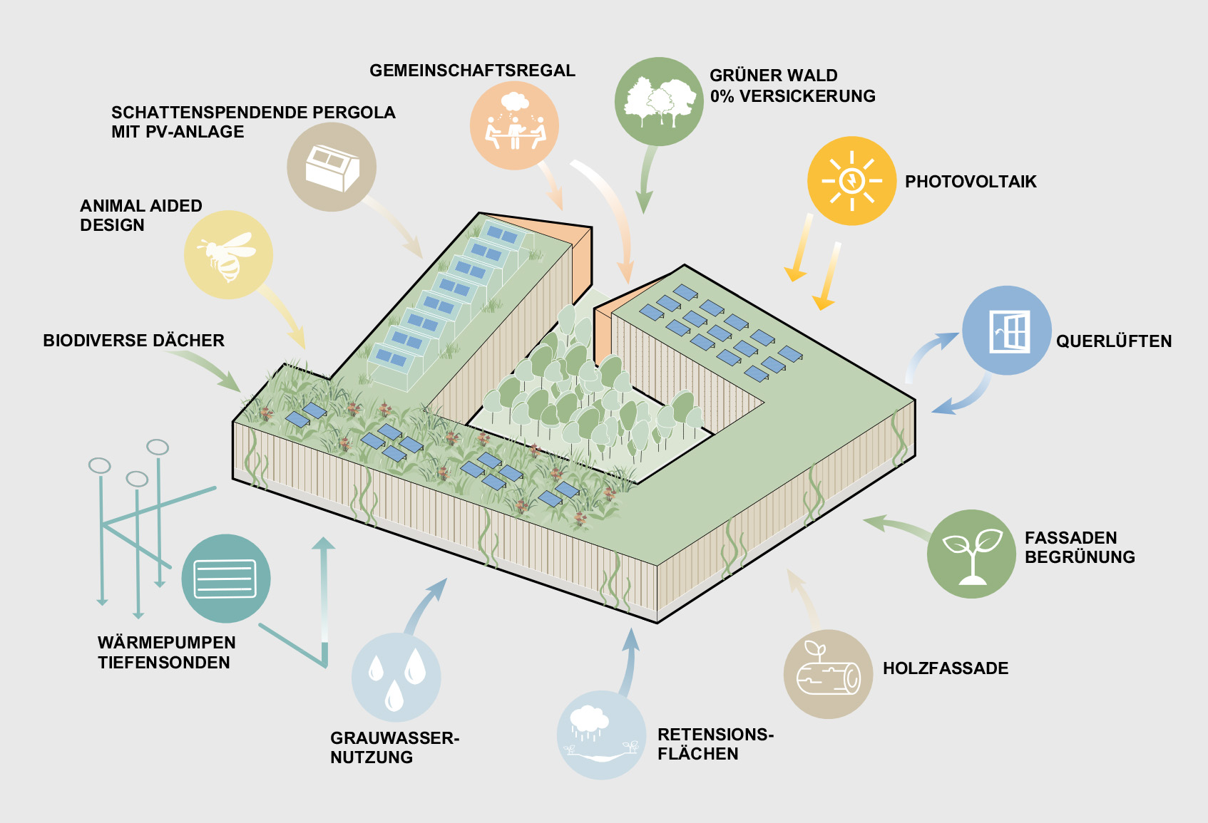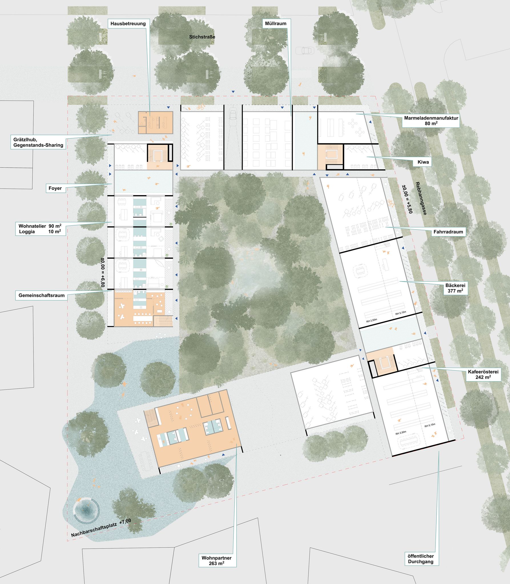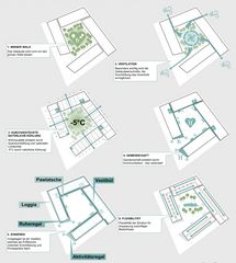 ein zentrales element des projekts ist der miyawaki-wald, ein kleiner urbaner wald im herzen des quartiers. dieser innenhof ist vollständig unversiegelt, was die pflanzung großer bäume und zahlreicher waldpflanzen ermöglicht. so entsteht eine grüne seele, die das gesamte projekt prägt und allen bewohnenden einen beruhigenden ausblick ins grüne bietet. durch die natürliche kühlung der umgebungsluft um bis zu -5°c sorgt der hof zudem für ein angenehmes mikroklima an heißen sommertagen.