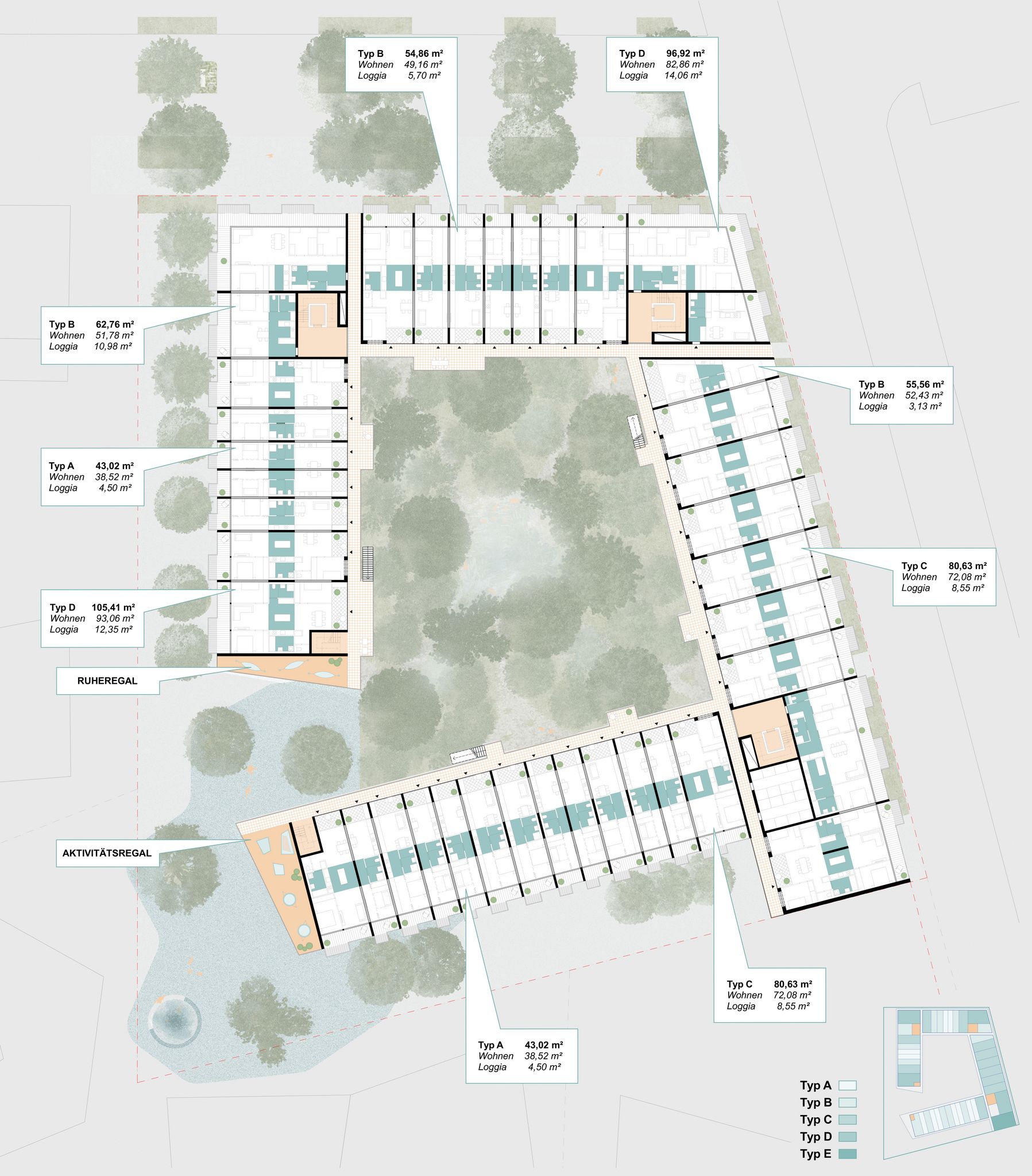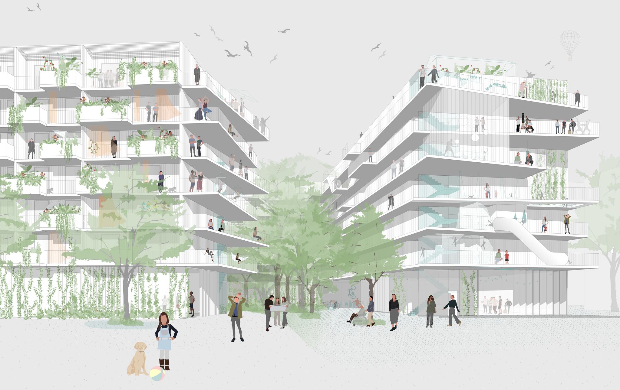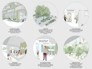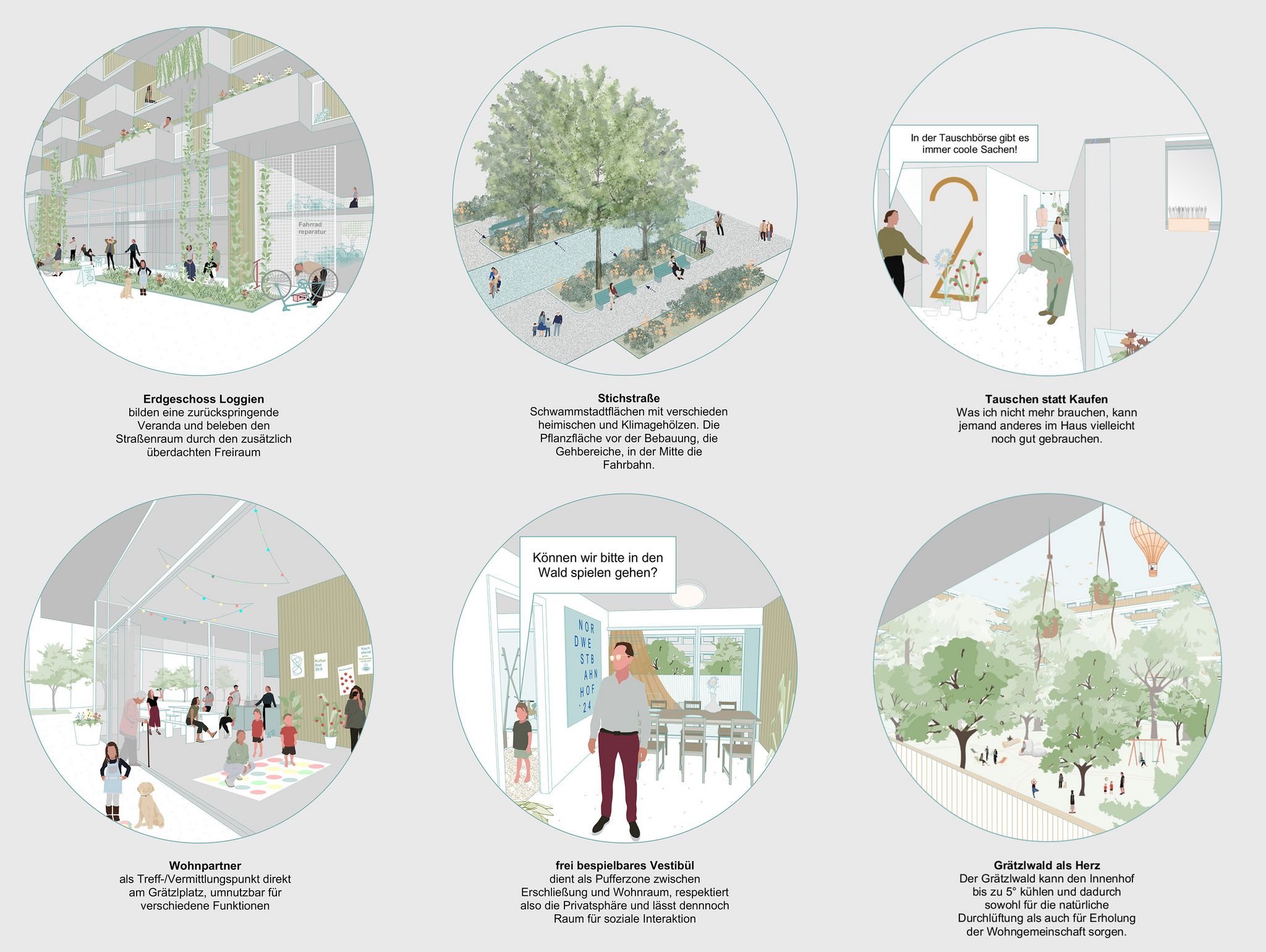 ein zentrales element des projekts ist der miyawaki-wald, ein kleiner urbaner wald im herzen des quartiers. dieser innenhof ist vollständig unversiegelt, was die pflanzung großer bäume und zahlreicher waldpflanzen ermöglicht. so entsteht eine grüne seele, die das gesamte projekt prägt und allen bewohnenden einen beruhigenden ausblick ins grüne bietet. durch die natürliche kühlung der umgebungsluft um bis zu -5°c sorgt der hof zudem für ein angenehmes mikroklima an heißen sommertagen.