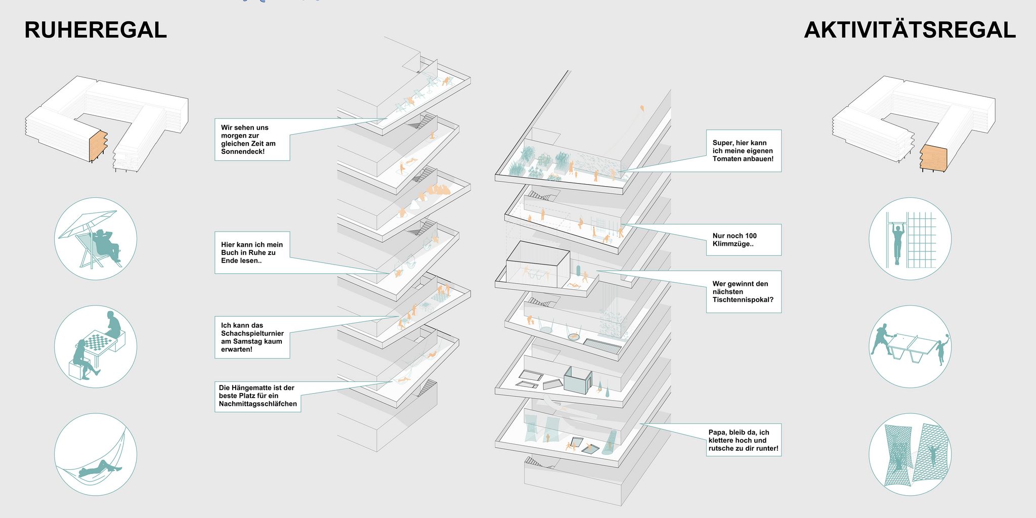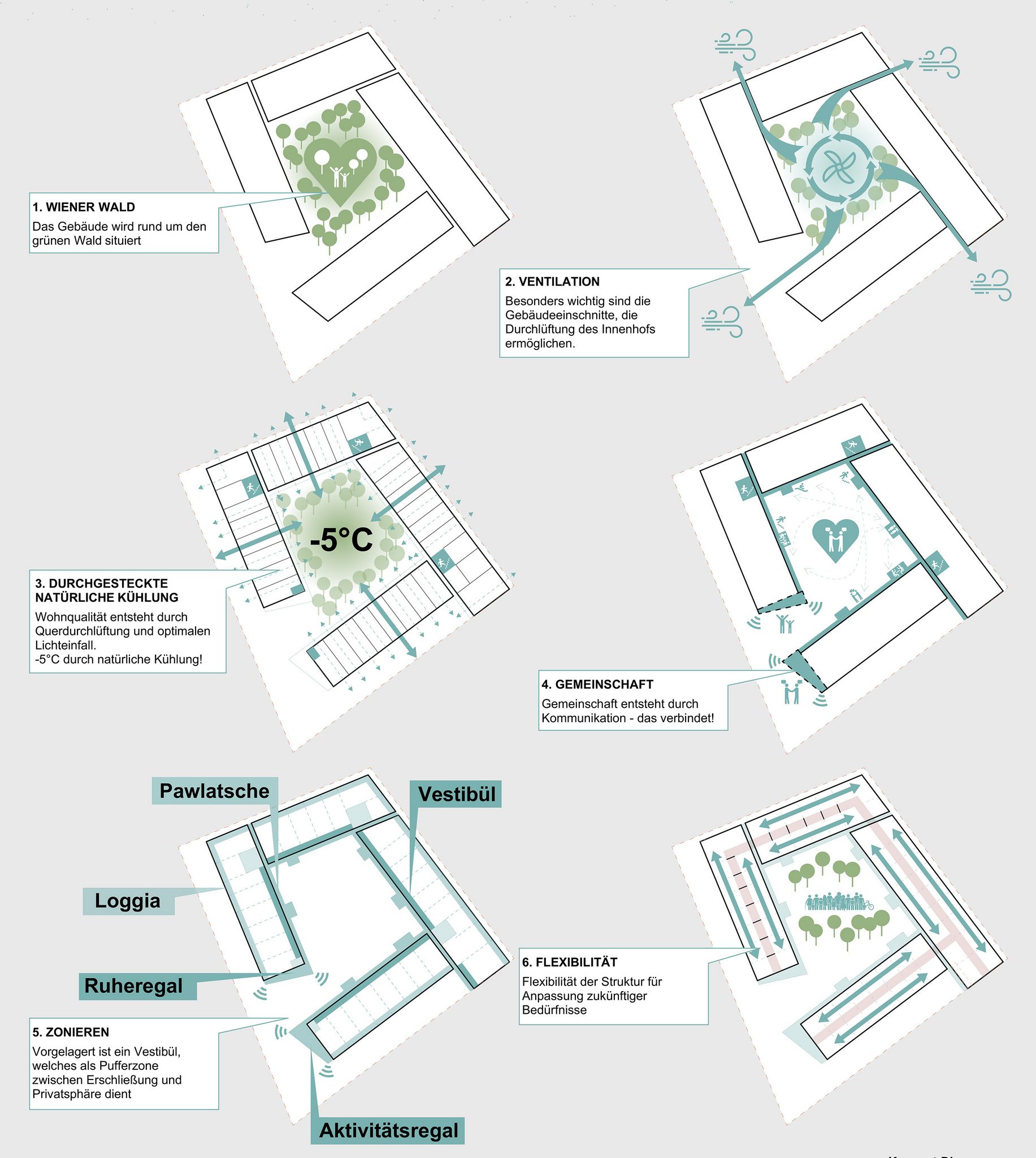 die architektur greift traditionelle wiener wohnformen auf und überführt sie in einen modernen kontext, der das soziale miteinander in den mittelpunkt stellt. die pawlatschen, als kommunikative bewegungszone gestaltet, fördern begegnungen und den austausch zwischen den bewohnenden. statt anonymer flure bieten diese offenen wege raum für spontane gespräche und begegnungen, was eine lebendige, nachbarschaftliche atmosphäre schafft. die gemeinschaftlichen „regale“ an den enden der pawlatschen dienen als treffpunkte für aktivitäten wie kochabende oder yoga-kurse und bieten platz für soziale interaktion.