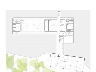 oberlichten zum turnsaal, die sich auf dem schuldeck befinden, ermöglichen blickbeziehungen hinein. eine sitzstufenlandschaft führt zum atriumhof im erdgeschoss-1 – wo sich die bibliothek und tagesbetreuung befinden. auch der überdachte haupteingang ist über das schuldeck erreichbar. über eine großzügige aula erfolgt die verteilung der schüler auf die verschiedenen geschoße.