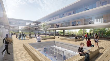 zentrales element der schule ist der terrassierte innenhof. er ist lebendige pausenfläche, treffpunkt für schüler und lehrer und durch die positionierung des haupteingangs ein hoch frequentierter, dynamischer freiraum. er ist das herz der schule. durch seine hanglage ist er kein hof im klassischen sinn, sondern viel mehr ein schuldeck, von dem aus man freien blick in die landschaft hat. die schüler können sich hier mit bezug zum umgebenden außenraum frei, und dennoch in geschützter atmosphäre, bewegen.