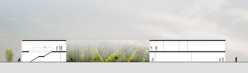 ultrafeiner wassernebel, knorrige äste und üppige blattstrukturen, jungpflanzen und totholz erschaffen miteinander ein spannungsvolles bild. das sprühen der befeuchtungsanlage klingt mit dem rauschen der blätter. eine gebaute wunschvorstellung paradiesischer natur, die ihre technologische basis feiert und das herzstück der nach innen gerichteten architektur bildet.