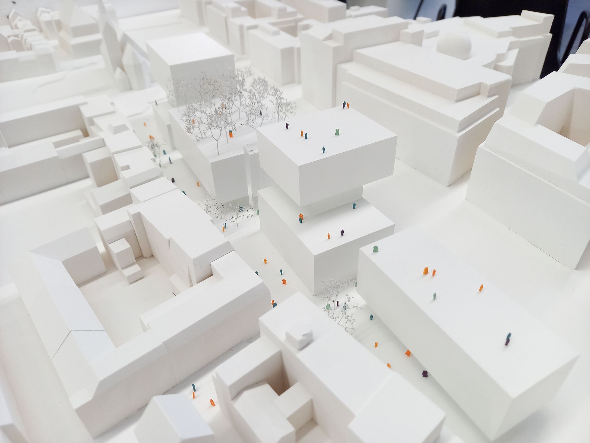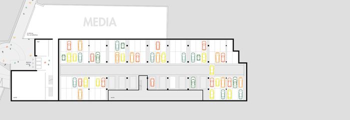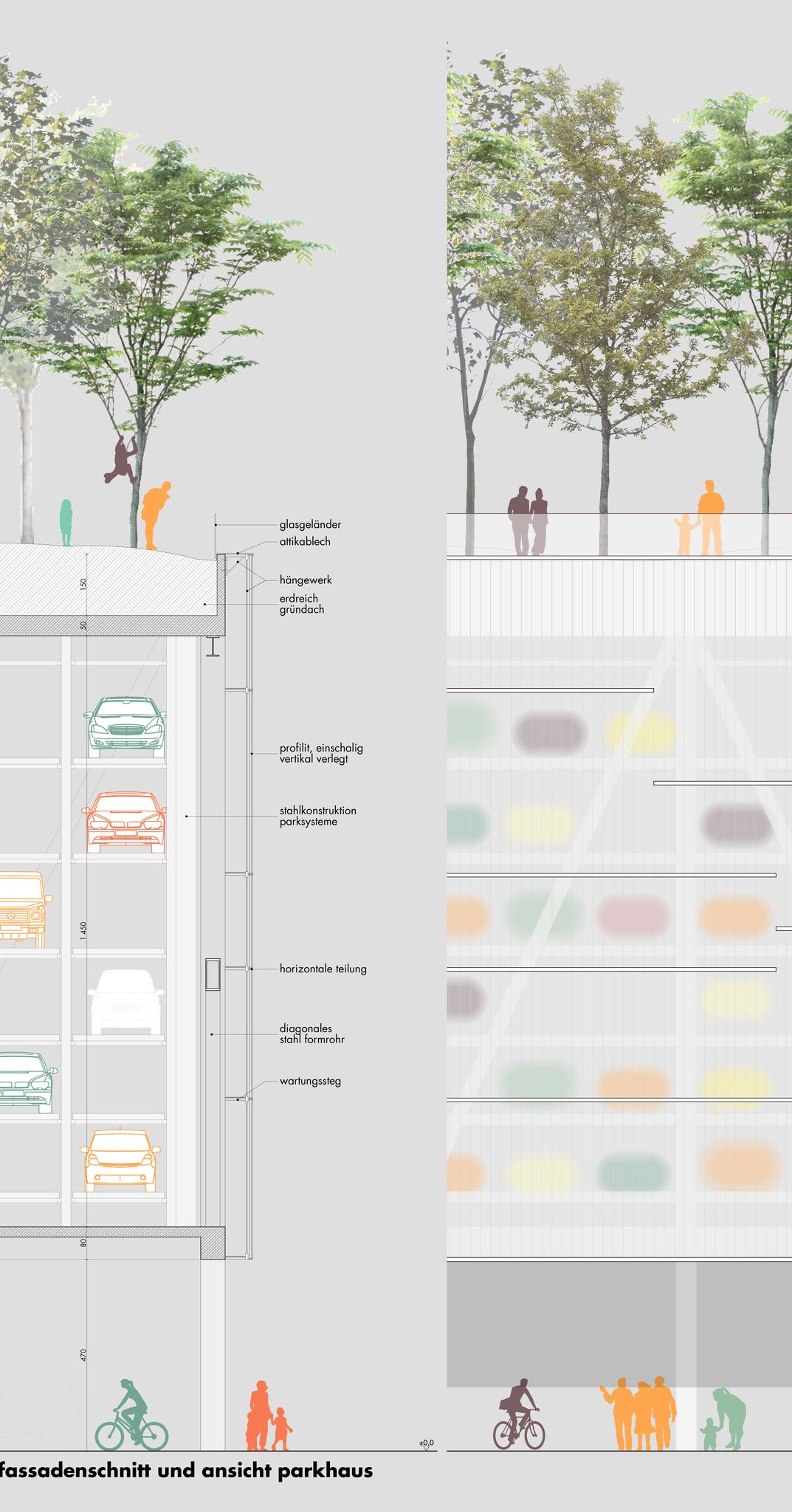 ein bestehendes parkhaus aus den 60er jahren war für die heutigen, größeren autos nicht mehr geeignet. daher war ein neues, größeres parkhaus zu entwerfen. querkraft verweigerte sich diesem fragwürdigen ansatz. stattdessen schafft unser entwurf durch ein kompaktes, vollautomatisches parkregal wesentlich größere möglichkeiten für die zeitgemäße stadtentwicklung.