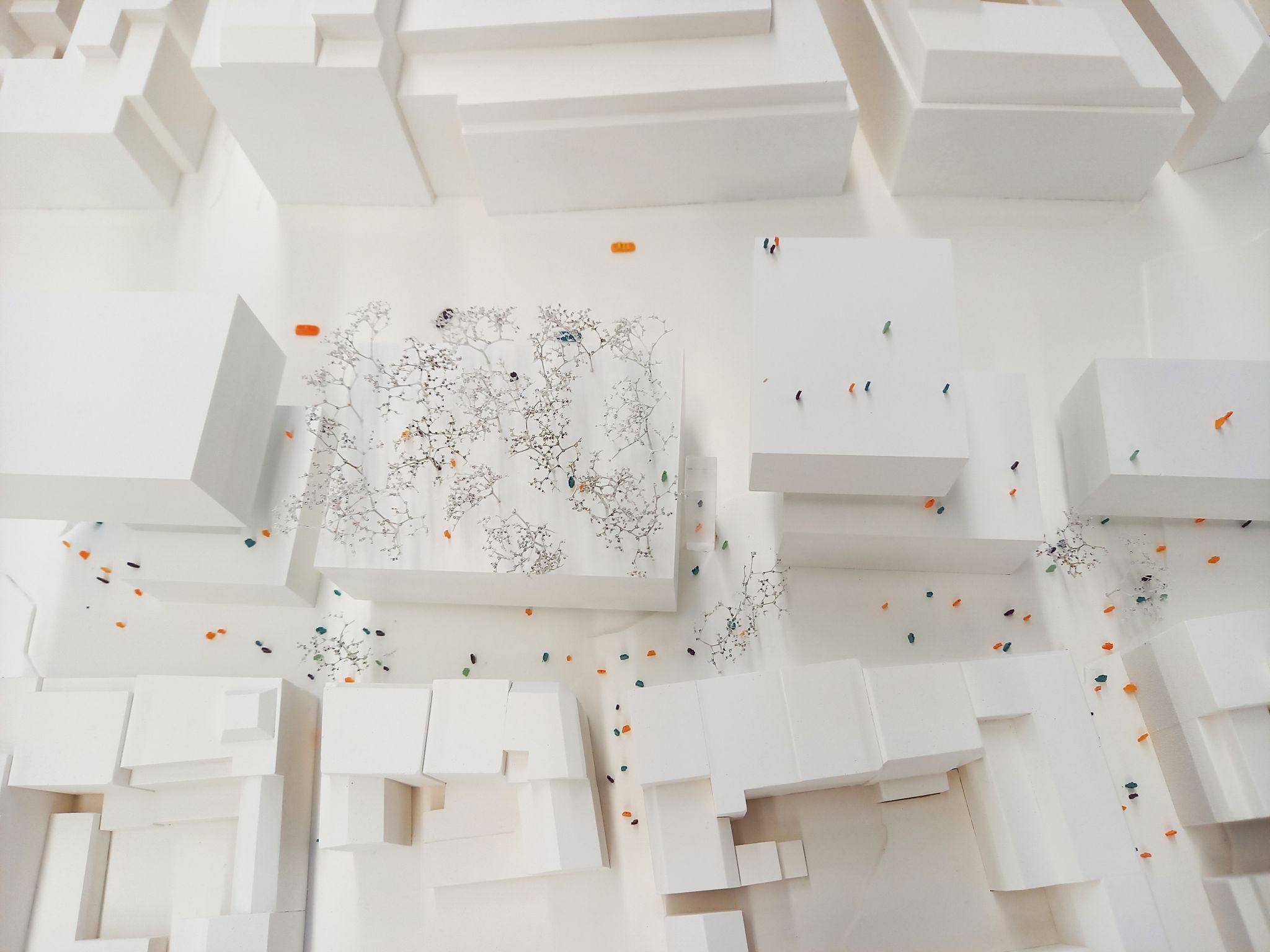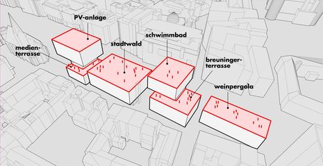 durch das zurückspringen des baukörpers an der fußgängerzone entsteht ein angemessener vorplatz für den neuen baustein. ebenfalls öffentlich und durchgehend zugänglich: das dach auf dem parkhaus. hier gibt es einen dichten stadtwald - dieser spendet frische luft, schatten und bringt echtes wald-feeling in die city.
