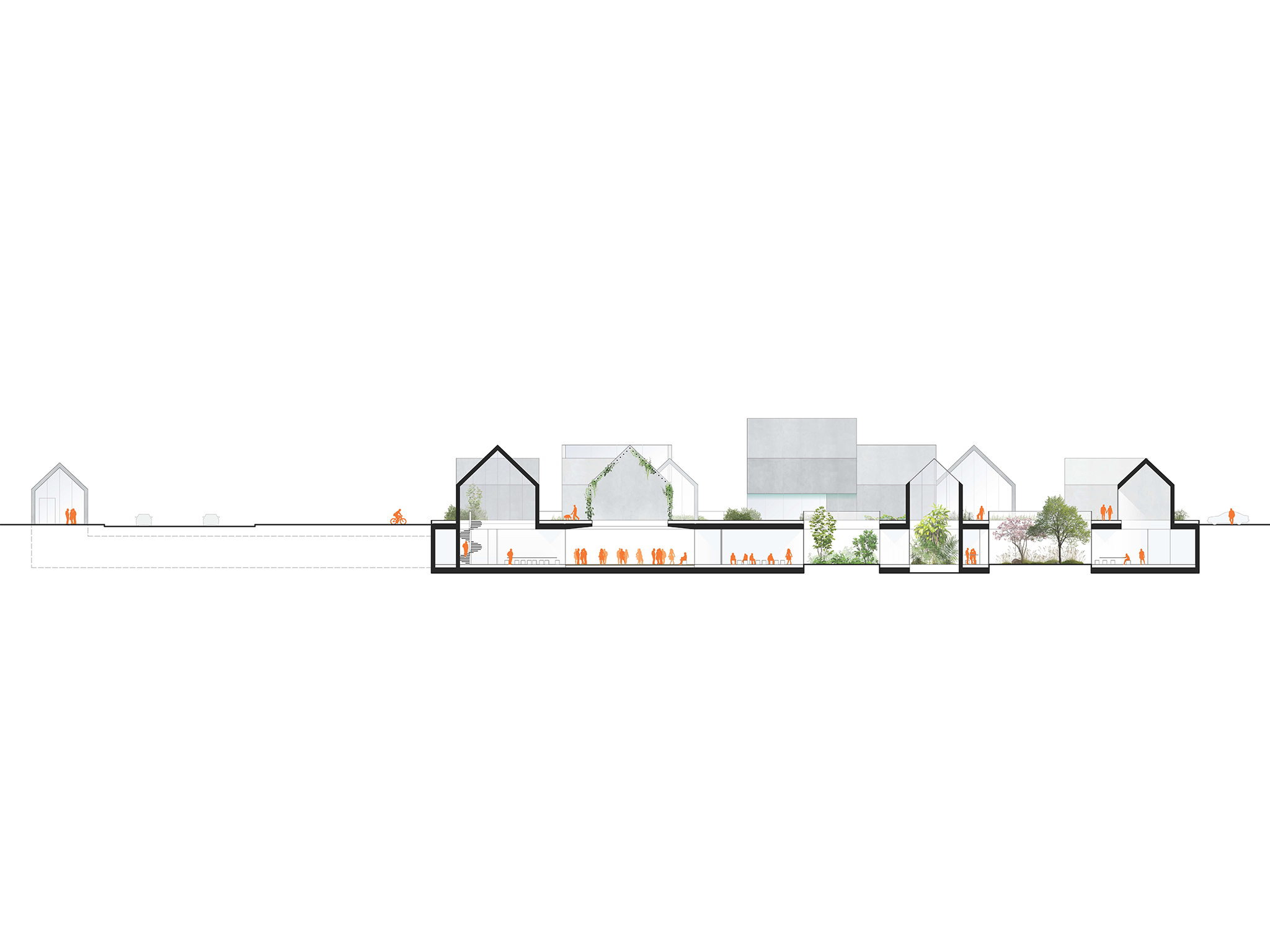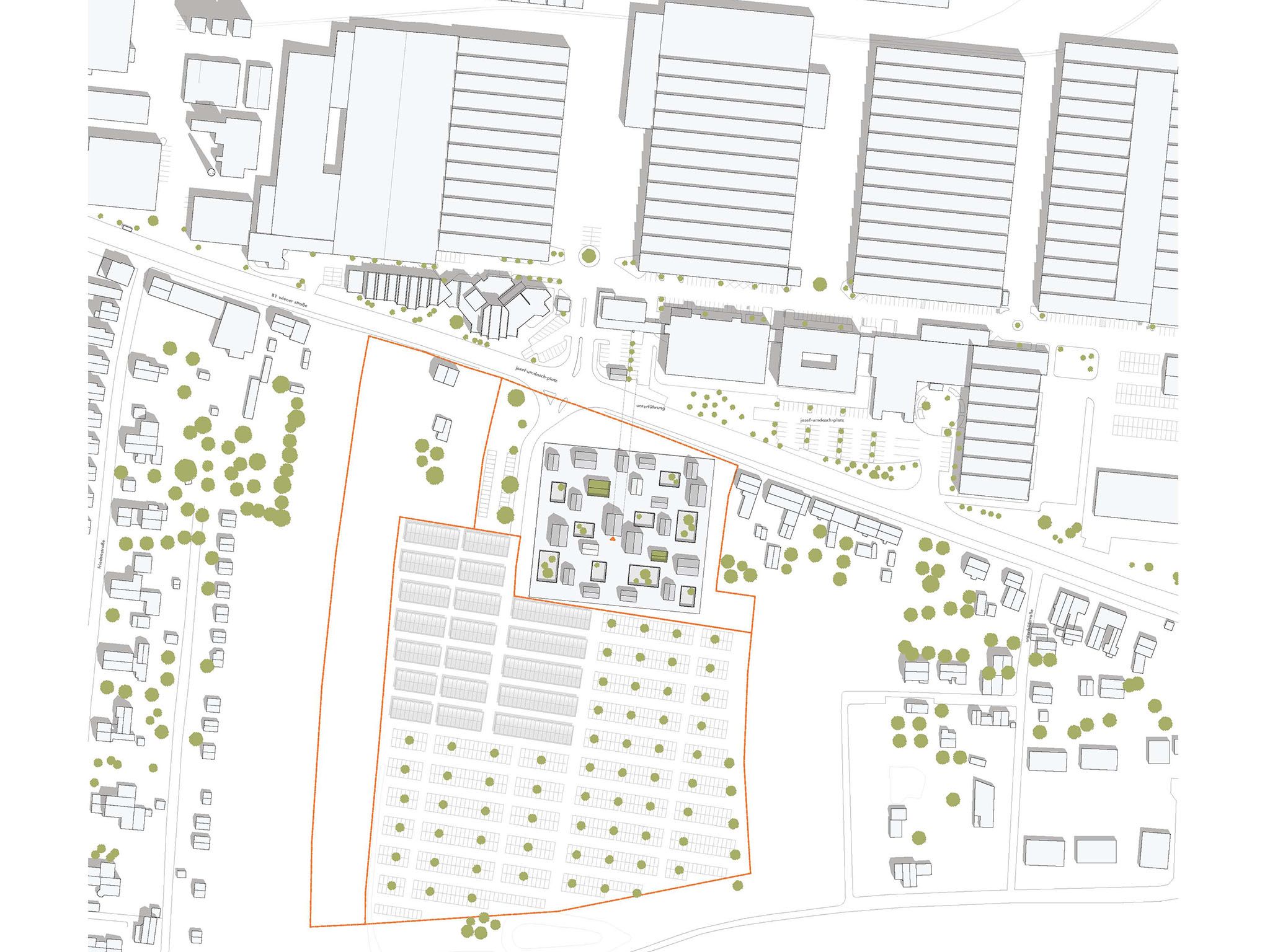 das zusammenspiel von baukörpern, die mit der volumetrie der umgebenden häuser spielen, bildet das neue tor zur stadt. die einzelnen objekte werden als präzise betonelemente wahrgenommen, welche die neugier der vorbeifahrenden wecken.