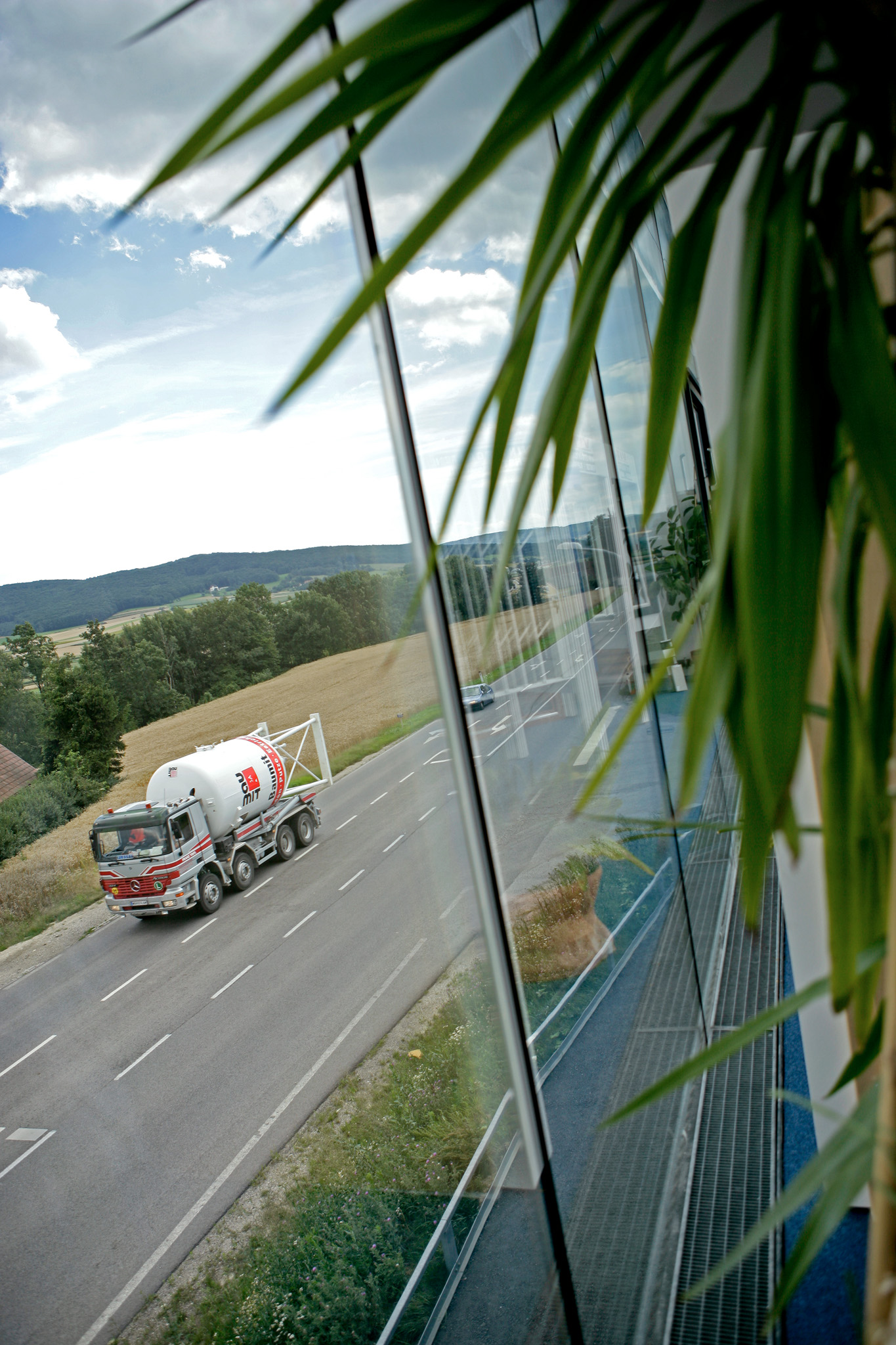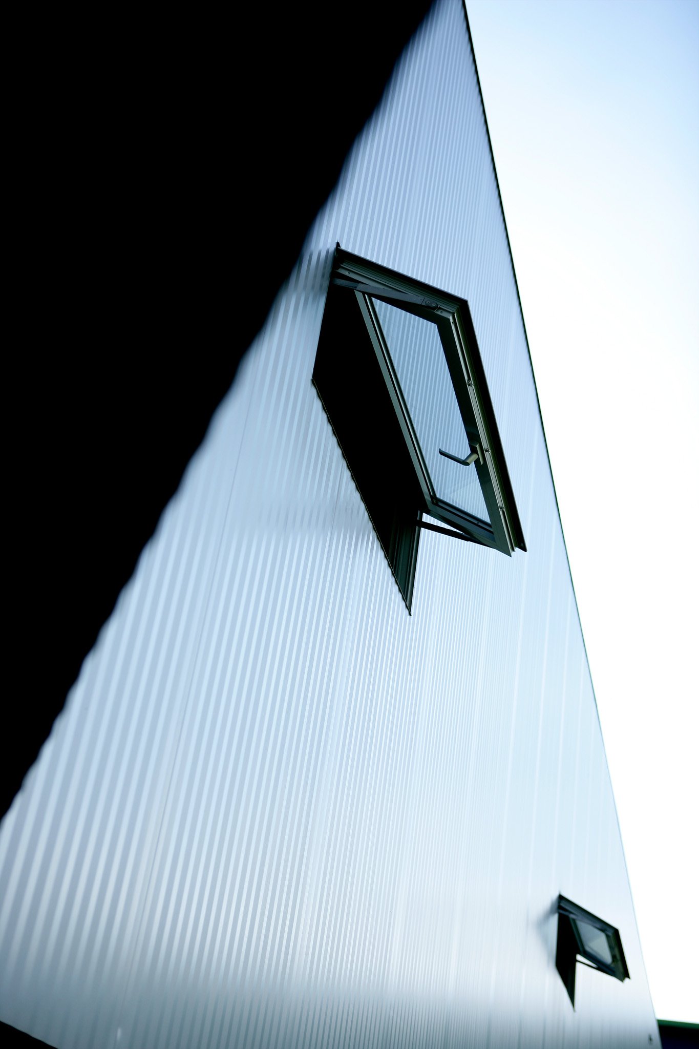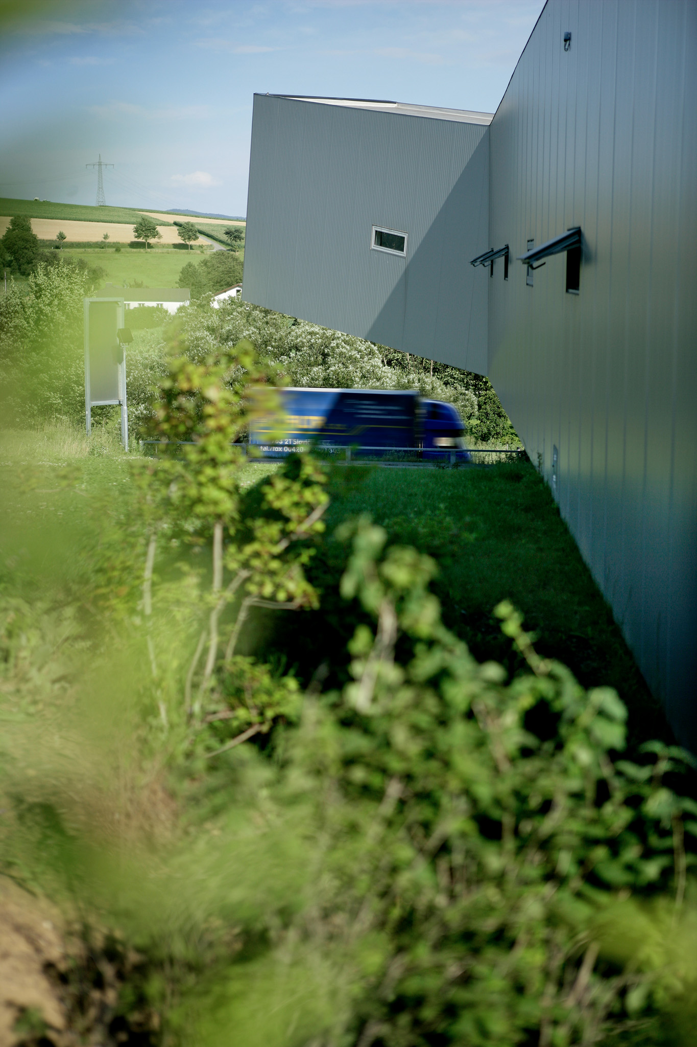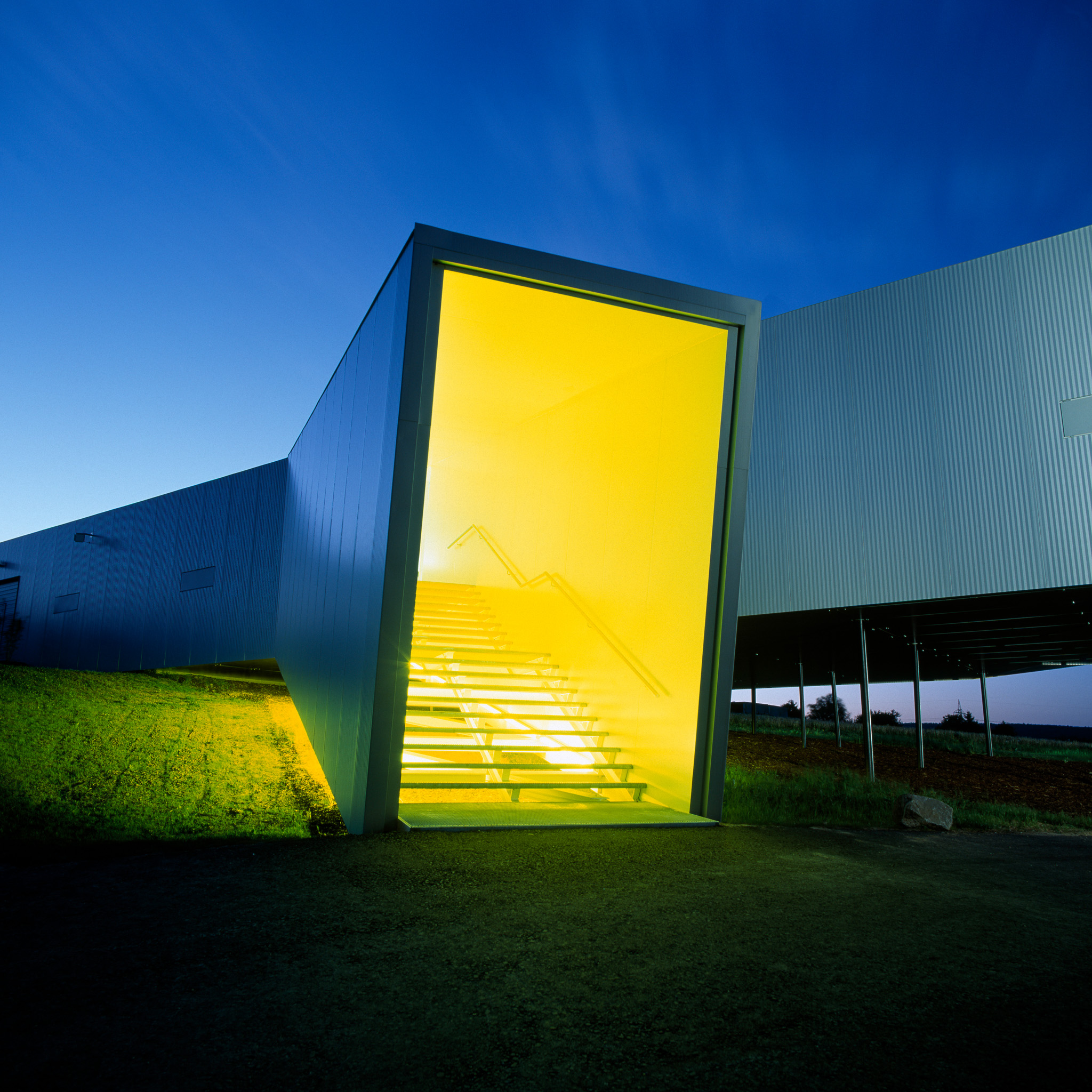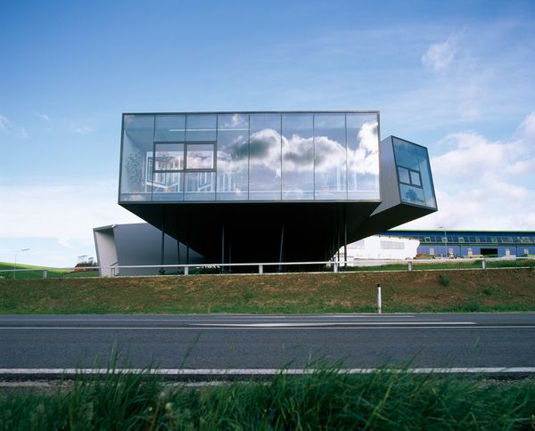 schauraum, büro, lager und werkstatt lautete das raumprogramm. der bauplatz ist ein schwierig zu bebauendes, geneigtes gelände. der wunsch des auftraggebers: ein eyecatcher neben der bundesstraße. außerdem möchte der firmenchef sein büro auf dem dach des objektes platzieren.