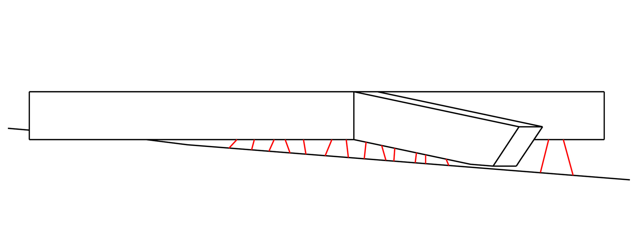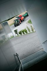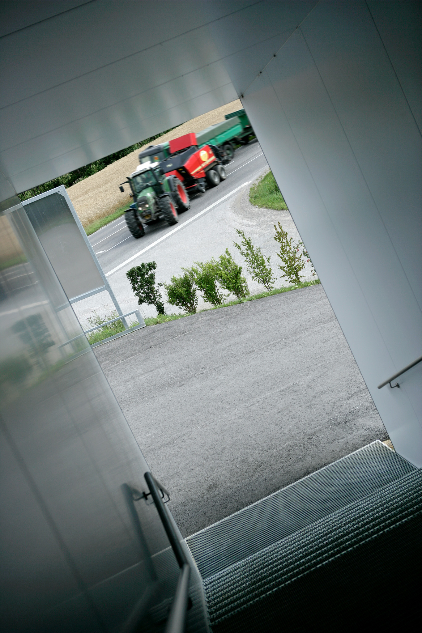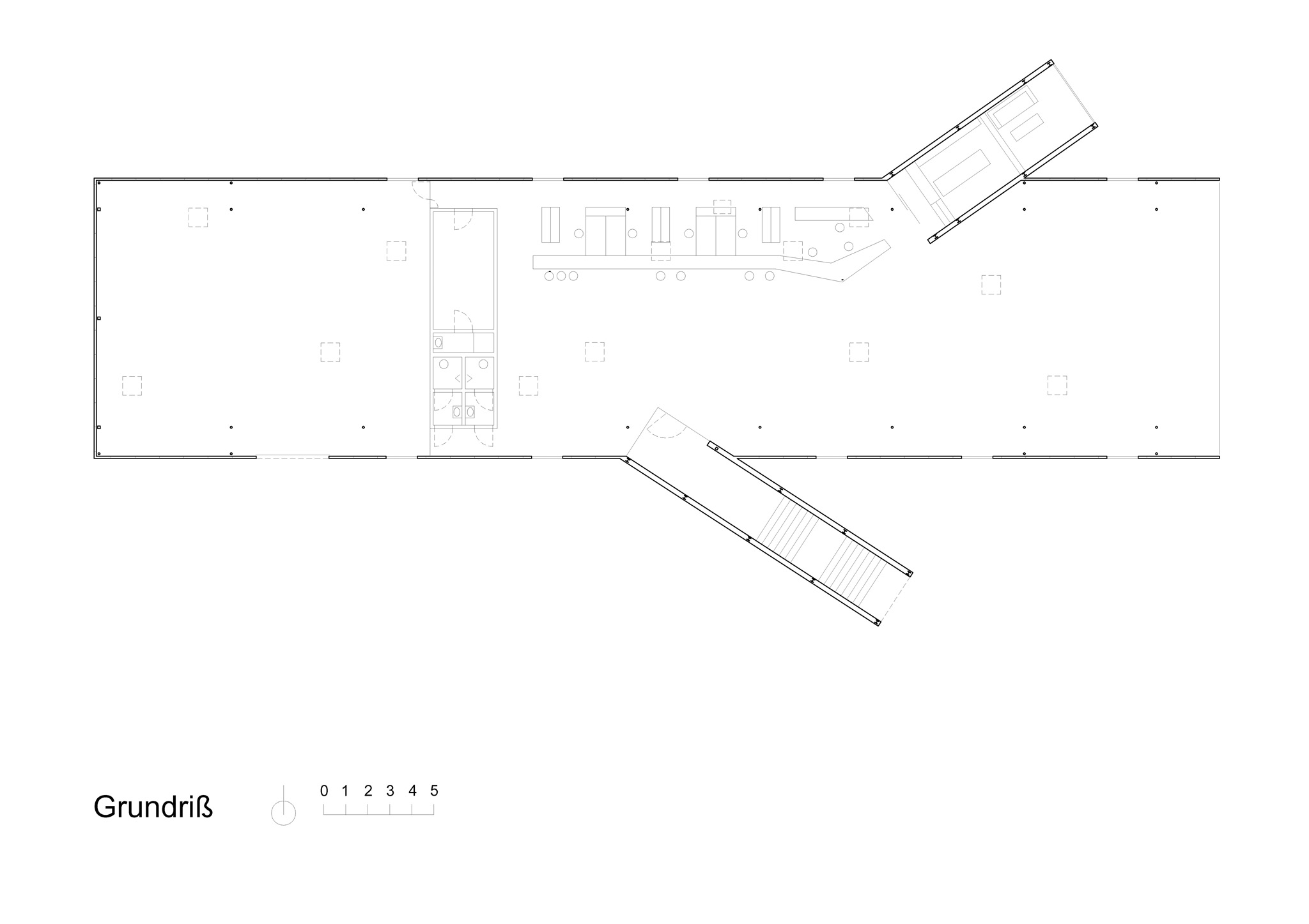 statt abzugraben und riesige stützmauern zu errichten, schwebt das gebäude über dem gelände. der chef wird nicht auf das dach gesetzt - das wäre zu viel hierarchie. er bleibt auf der ebene seiner mitarbeiterInnen, allerdings leicht erhöht und mit besonderem ausblick. der zugang ist das dramaturgisch besondere element auf der gegenüberliegenden seite des gebäudes.