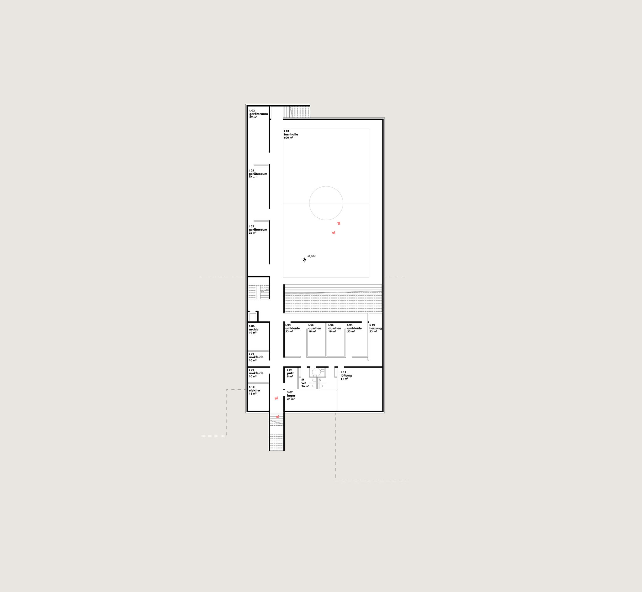 während einer öffentlichen veranstaltung kann der turnsaal zusammen mit dem speisesaal und dem veranstaltungssaal unabhängig von der restlichen schule erschlossen werden.