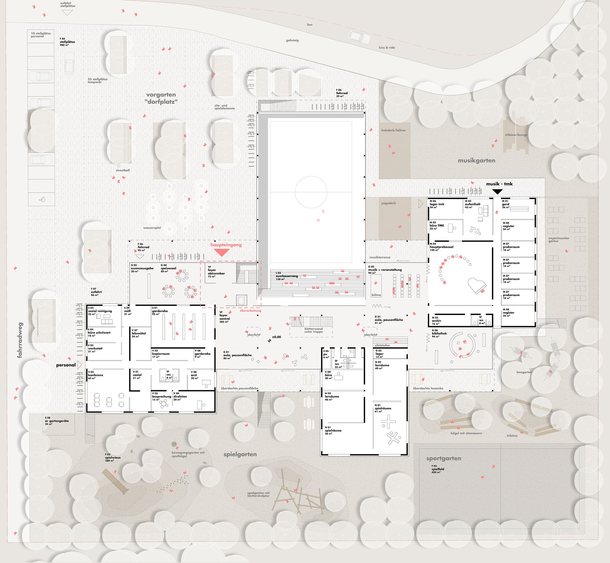 die freiraumgestaltung reagiert mit der bepflanzungsdichte und den oberflächenmaterialien auf den übergang von öffentlich zu schulintern.